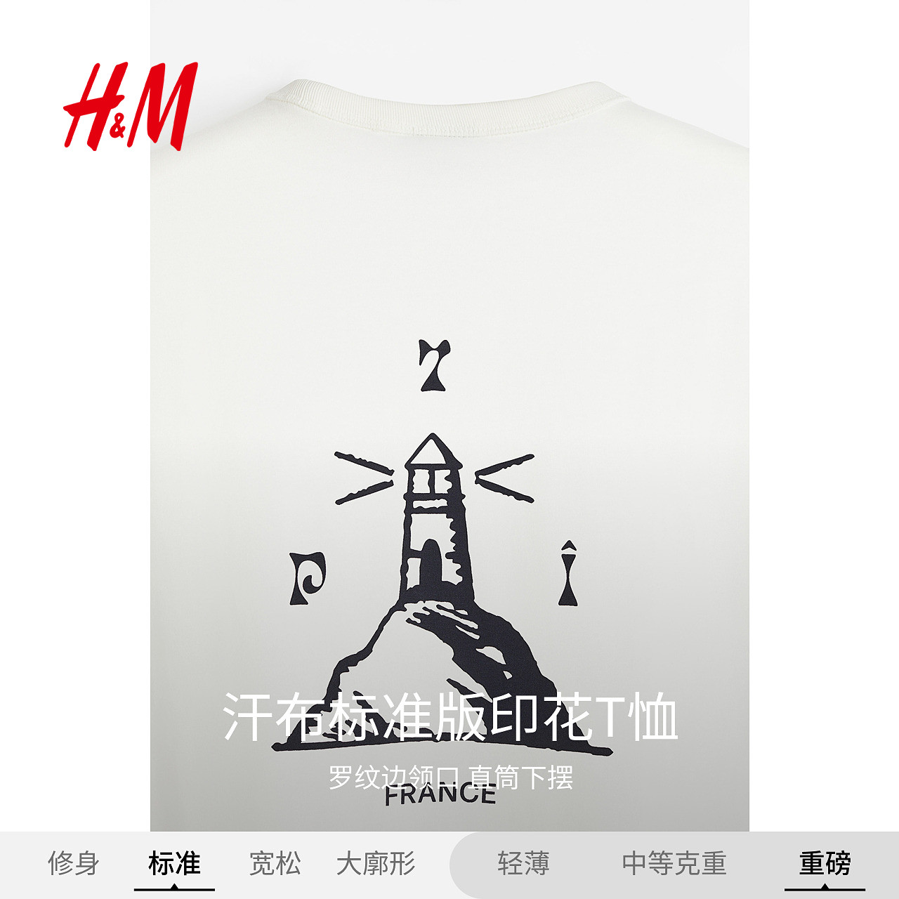 HM男装女装T恤春季情侣装COOLMAX®凉感灯塔印花重磅短袖1216501