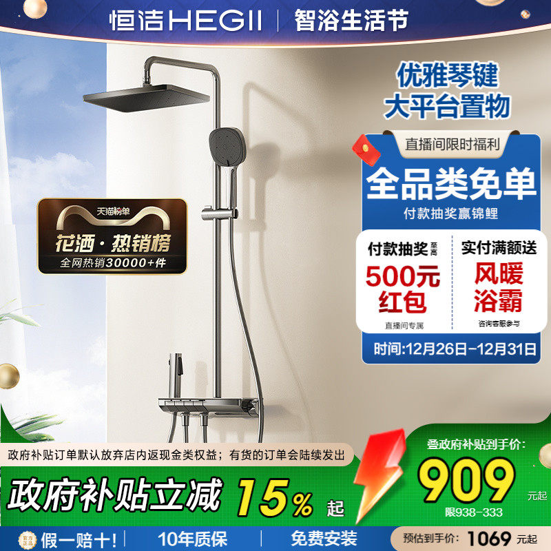 恒洁钢琴按键花洒套装淋浴器家用置物浴室卫生间明装易洁除垢Y55