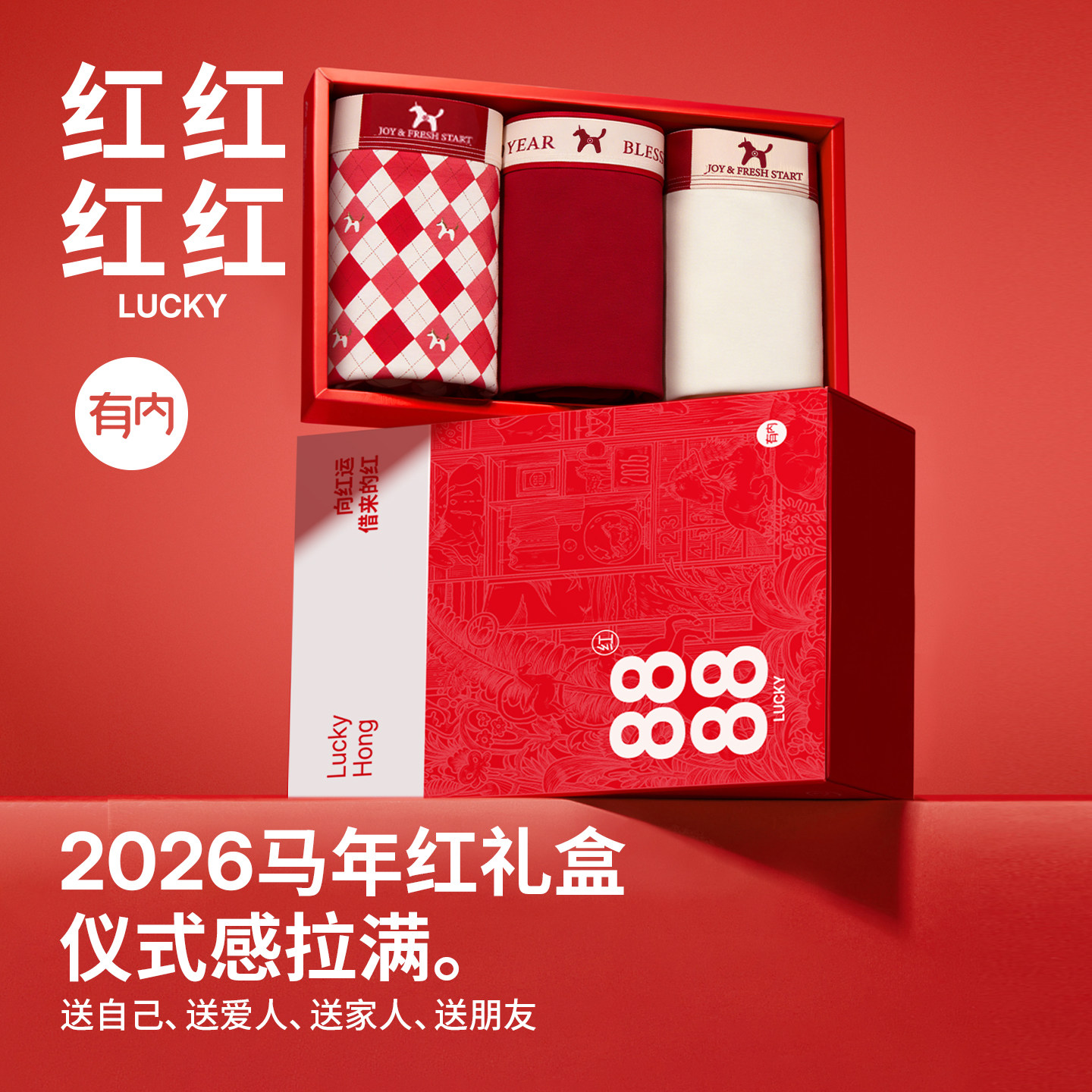 有内红色内裤男士马年纯棉抗菌裆本命年结婚新款礼盒套装四角短裤