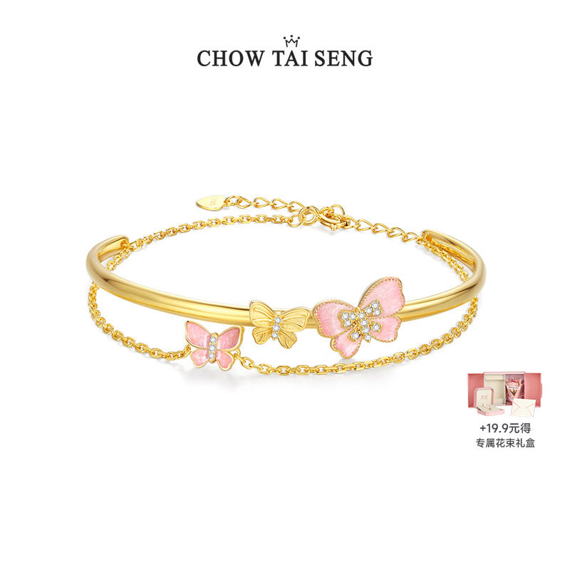 周大生蝴蝶珐琅手镯纯银精致高级双层开口可调节生日礼物送女友