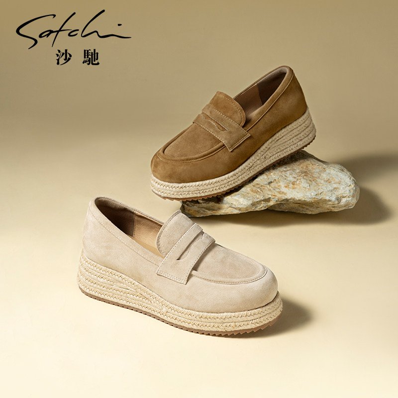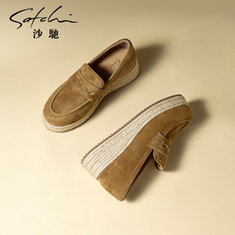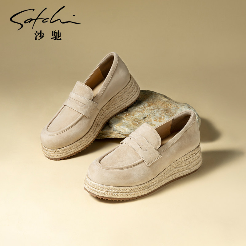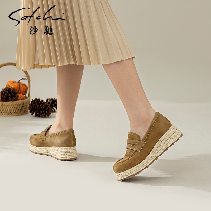 沙驰女鞋厚底增高休闲乐福鞋2025秋冬新款民族风真皮坡跟单鞋深口