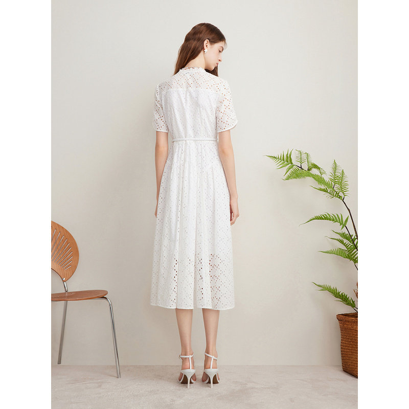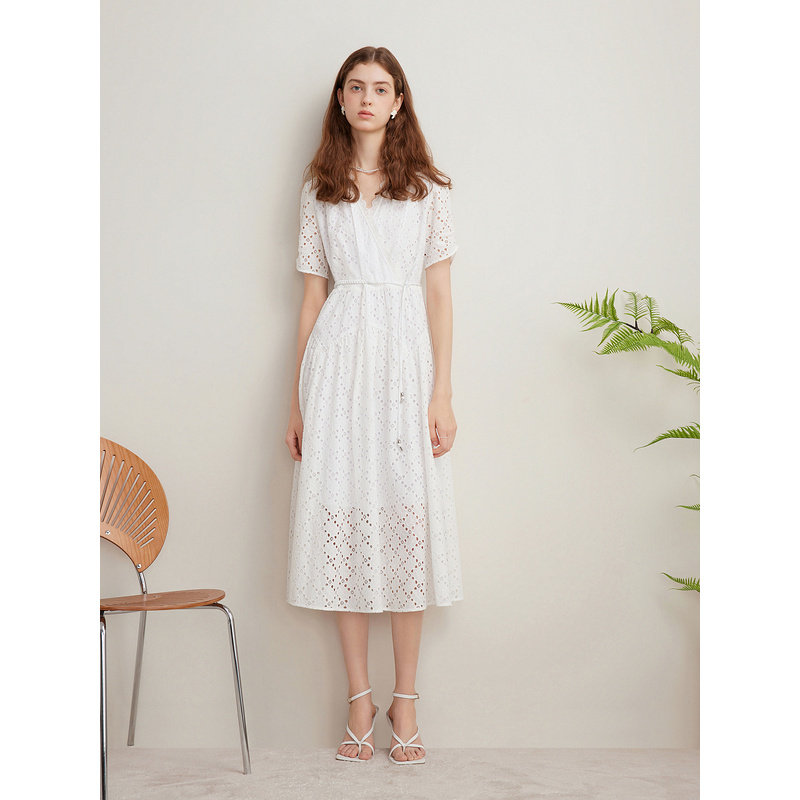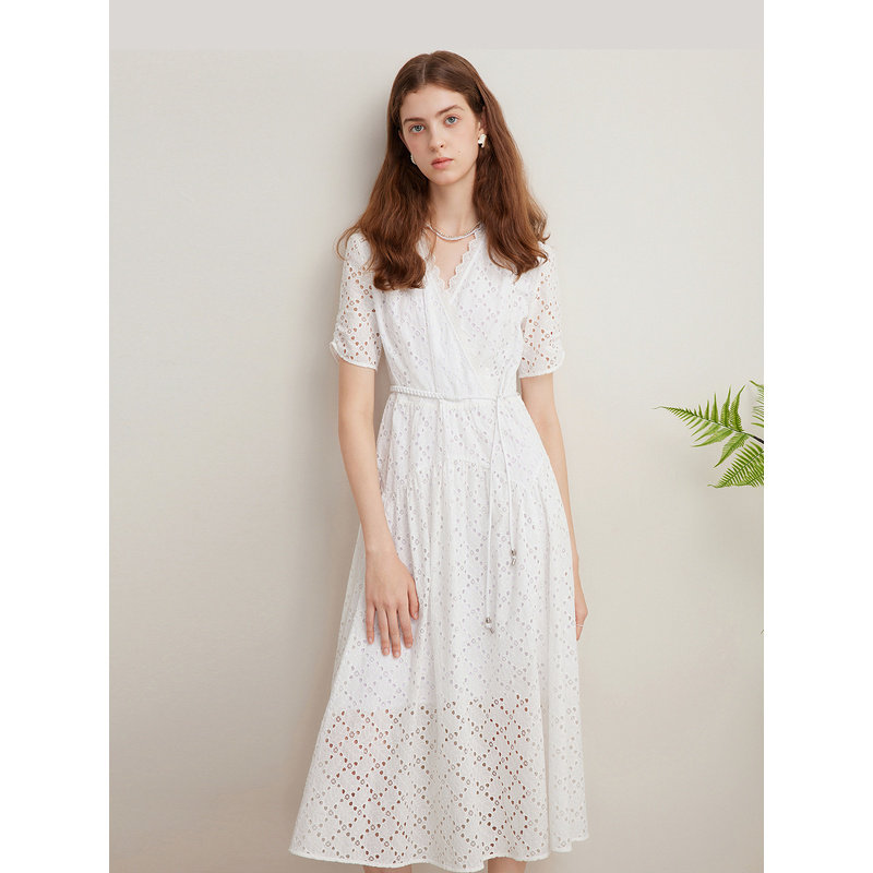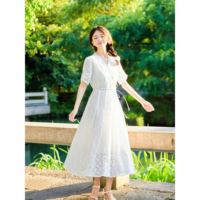 Goodland美地夏季高支棉白月光仙女裙刺绣V领连衣裙