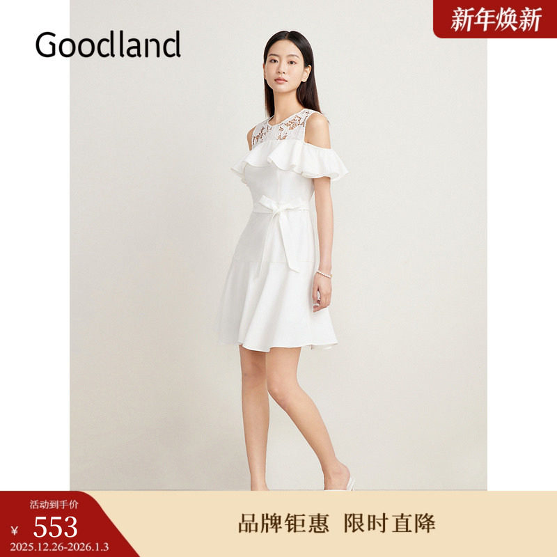 Goodland美地夏季镂空刺绣露肩荷叶花边仙女连衣裙