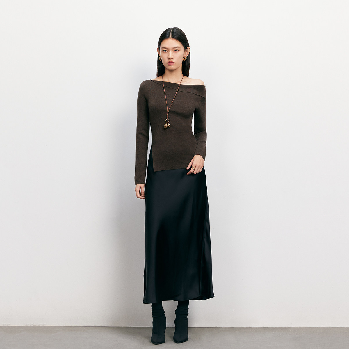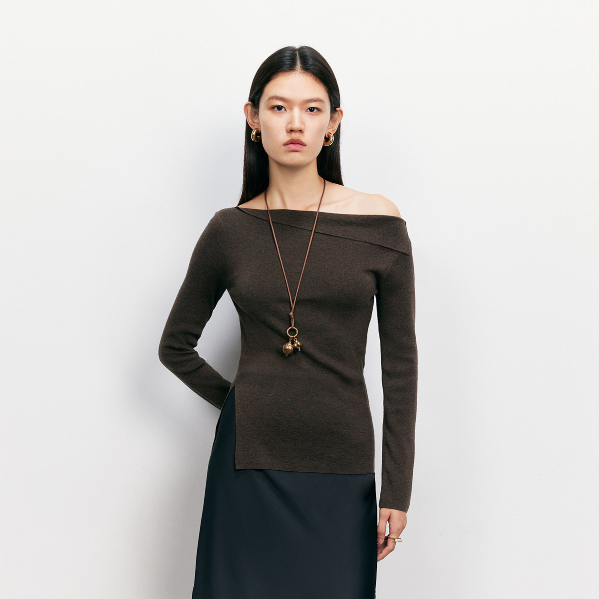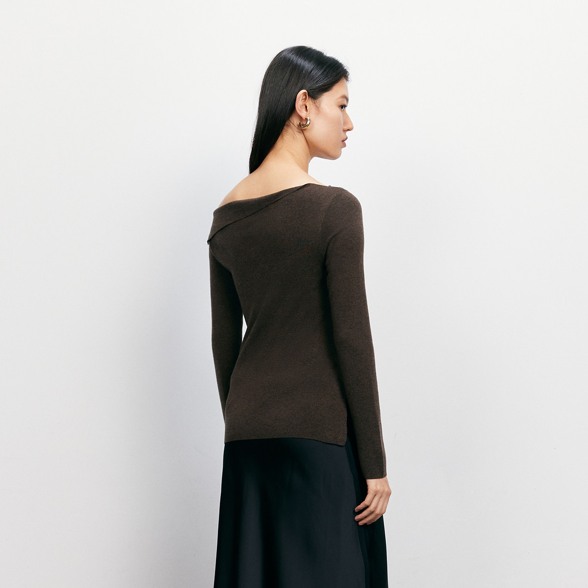 斜领搭配露肩,打造出肩部不对称效果