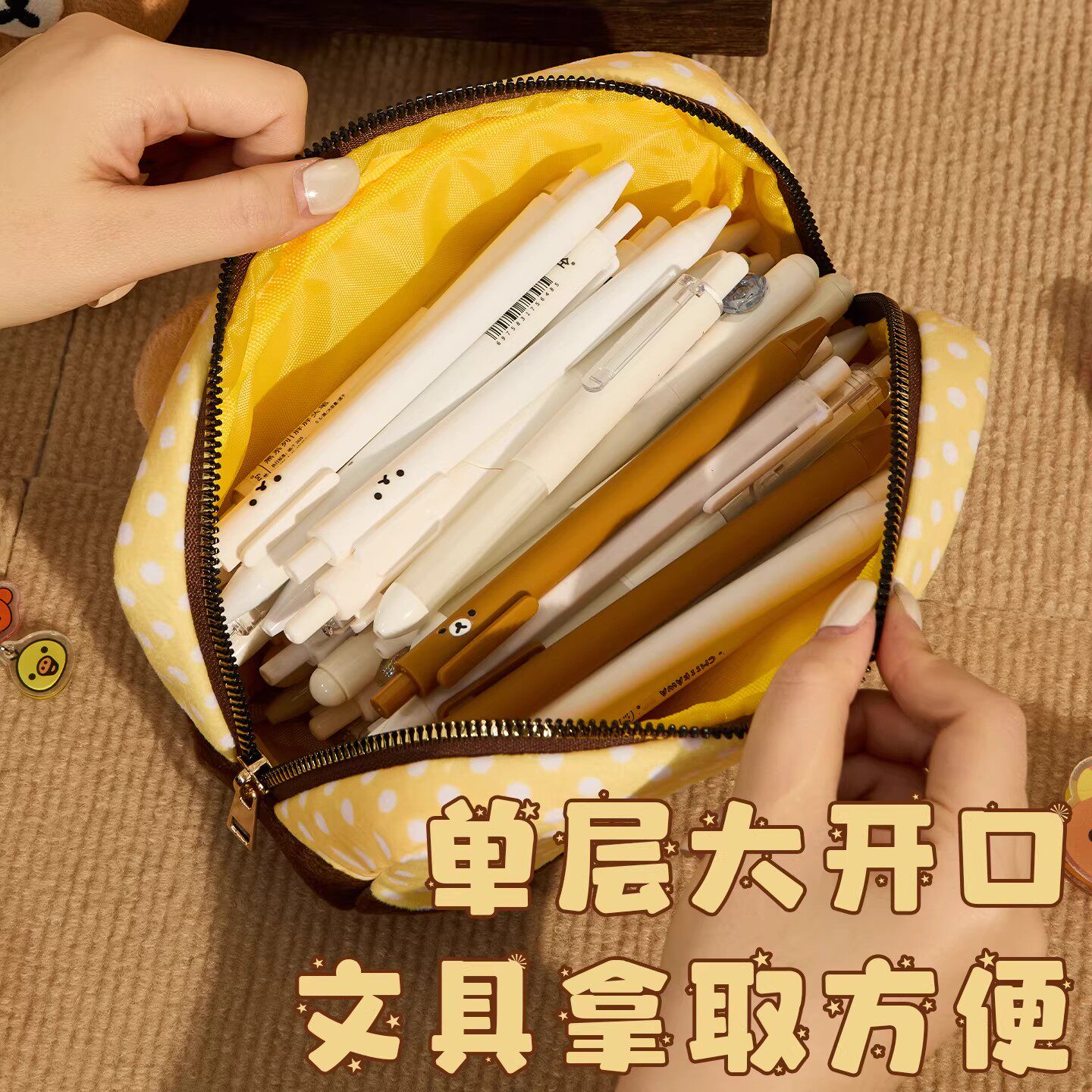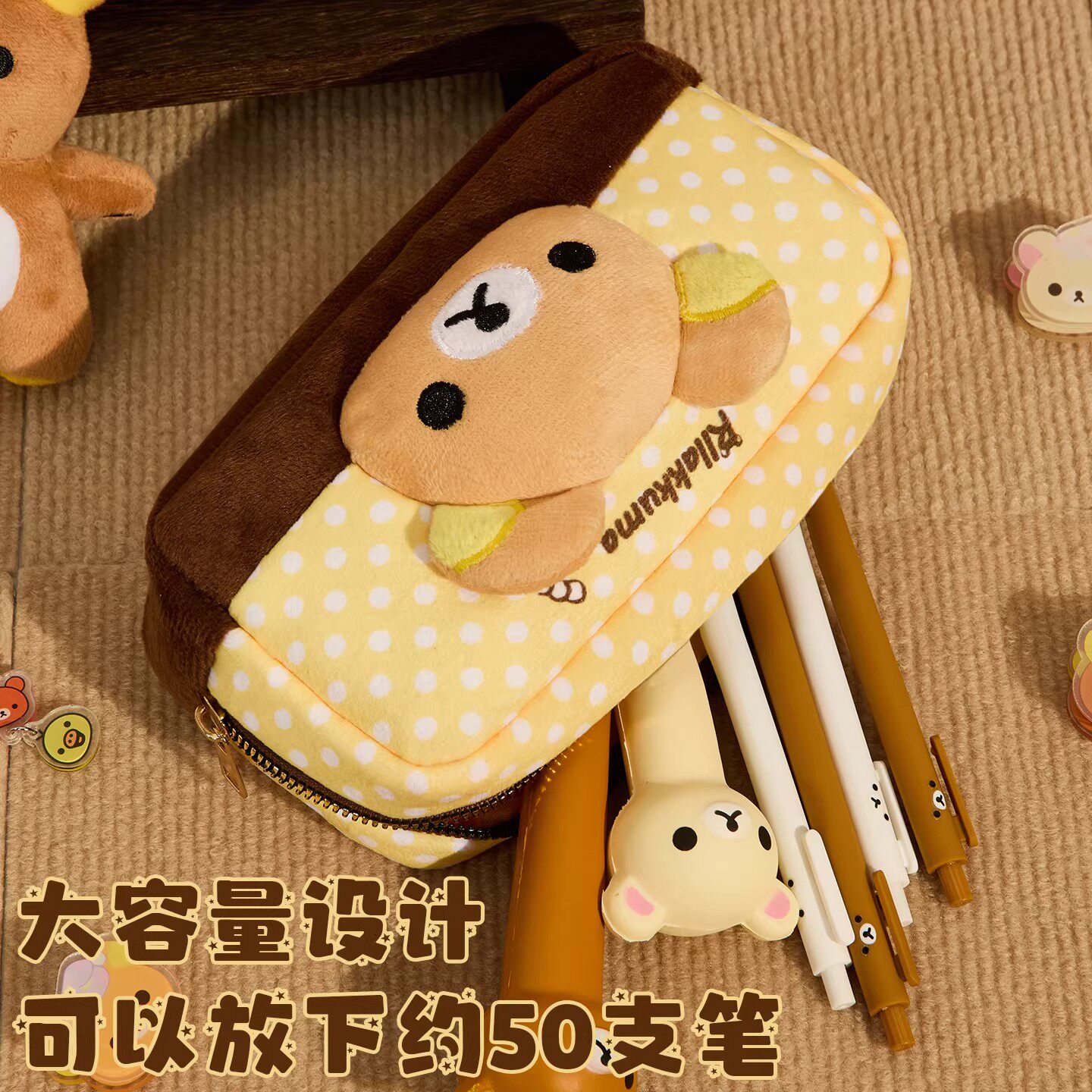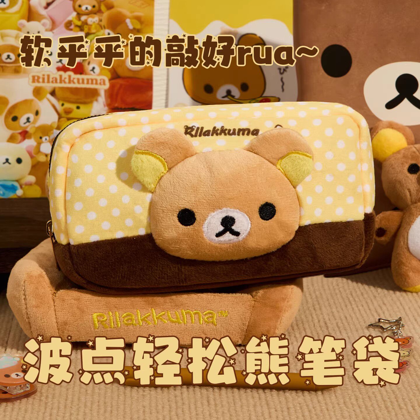 波点轻松熊毛绒笔袋高颜值简约ins风女孩2025年新款文具盒学生大容量小众可爱铅笔盒波点拼色卡通文具收纳包~