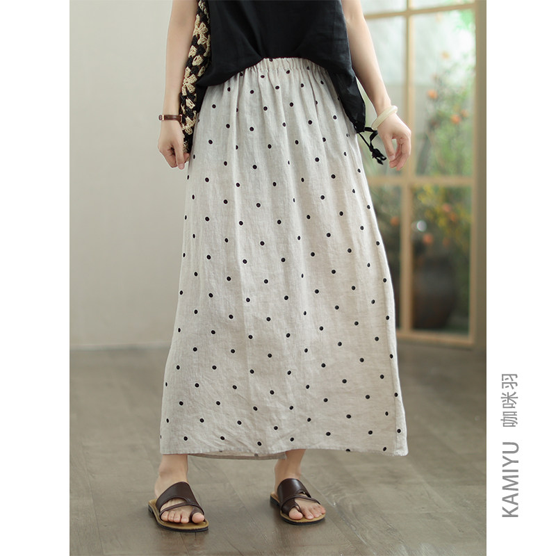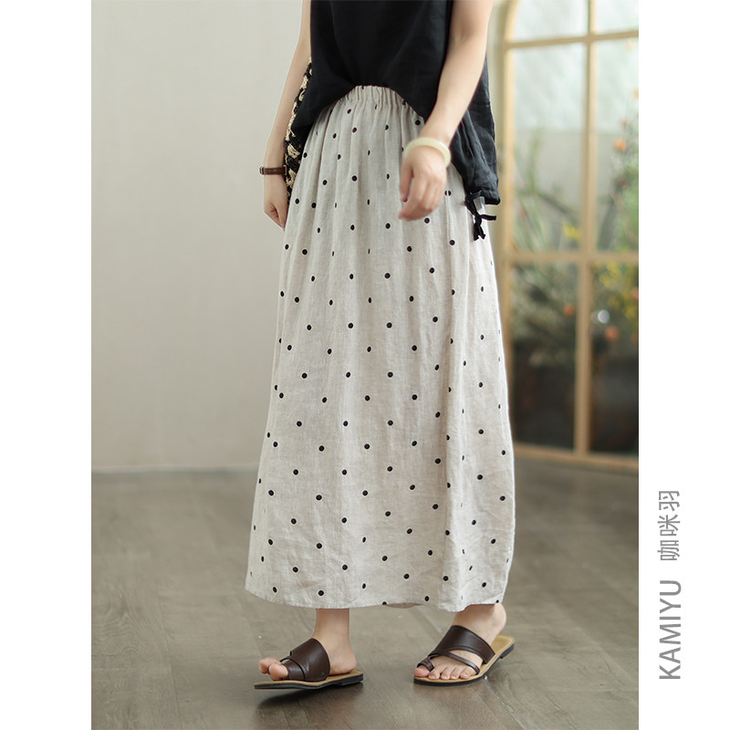 咖咪羽100%亚麻夏季新款裙子女波点宽松中长款松紧腰女装半身裙女