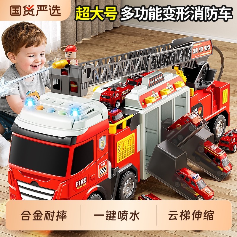 儿童大号变形消防车玩具男孩合金洒水车消防员救援车挖掘机多功能