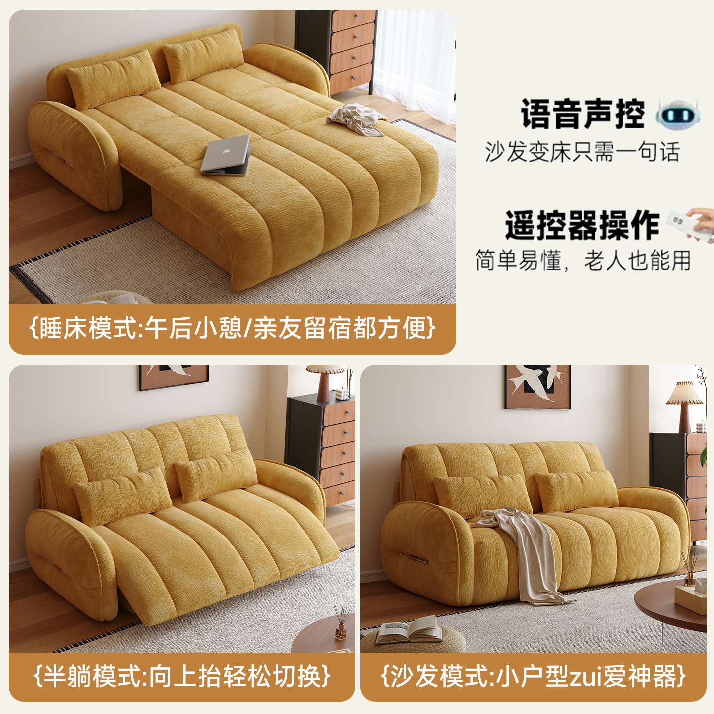 木宫匠南瓜电动沙发床一体两用可伸缩雪尼尔客厅可调节沙发多功能