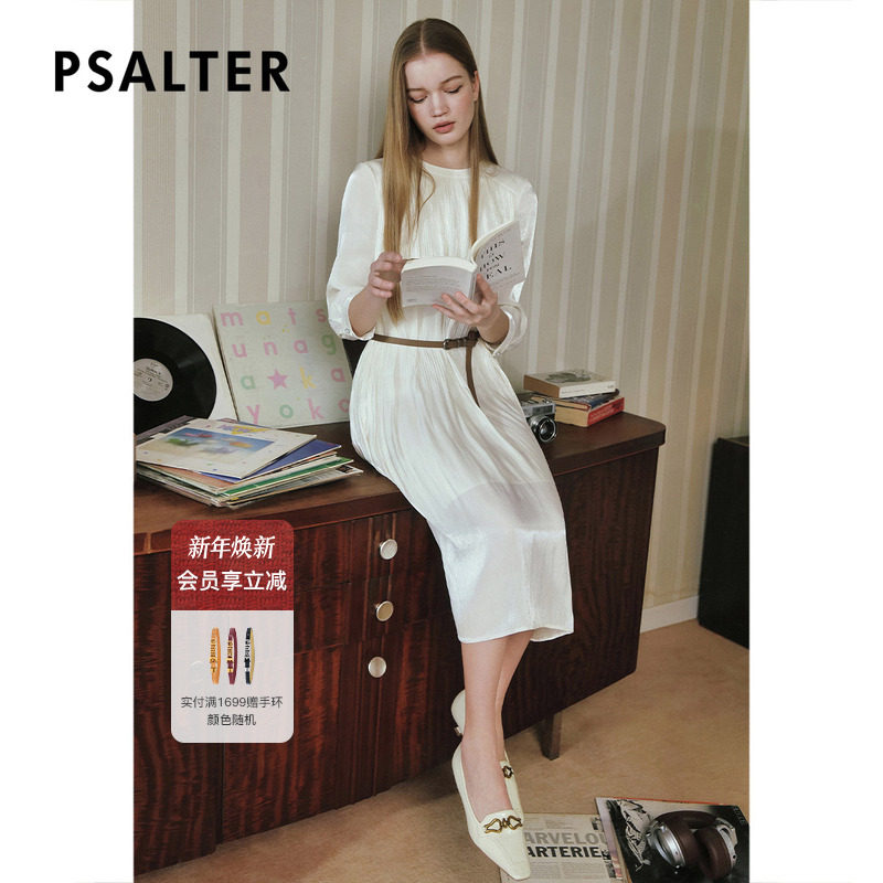 诗篇专选艺术感不规则压褶撞色皮带七分袖修身连衣裙2025春季新款