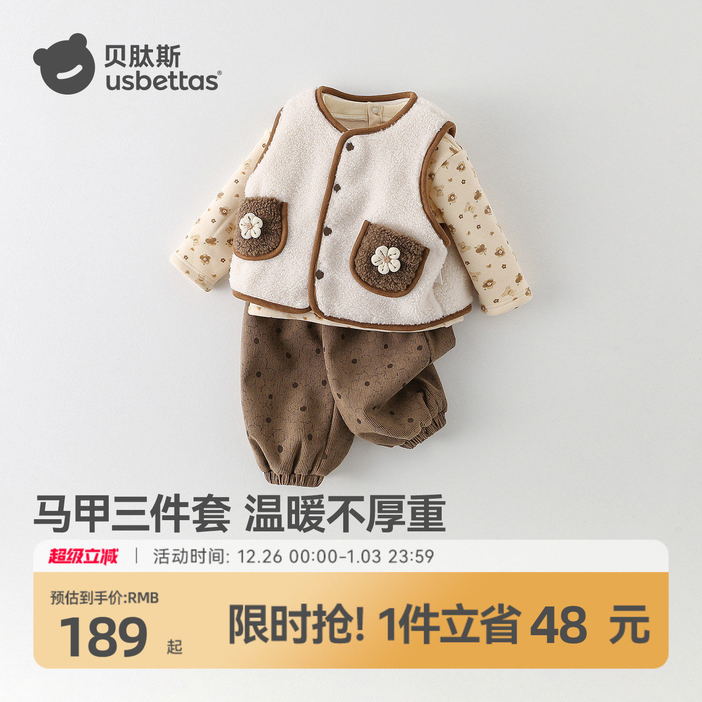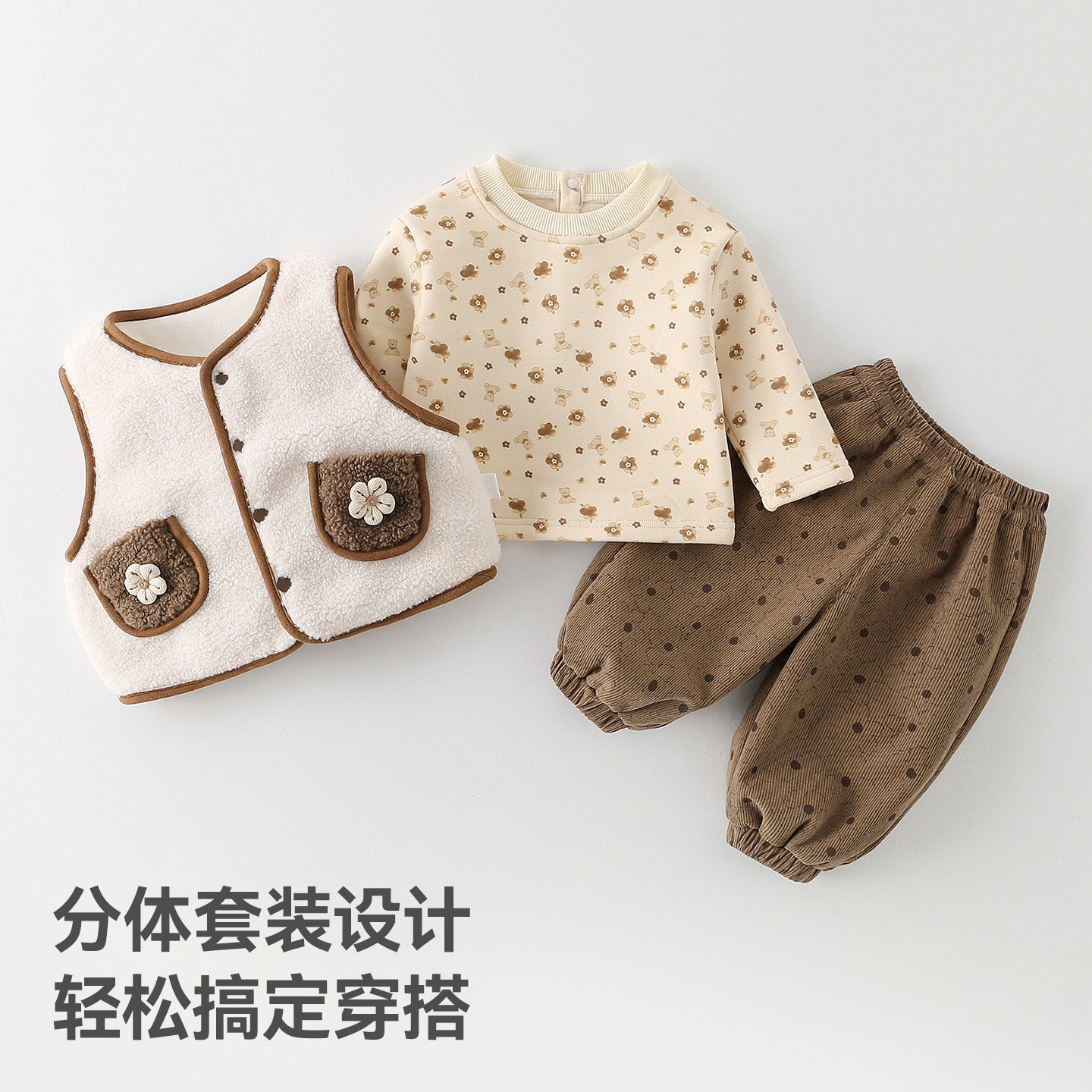 贝肽斯宝宝马甲套装女2025冬季加绒保暖长袖T恤背心长裤子三件套S
