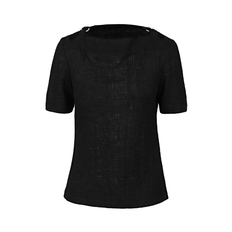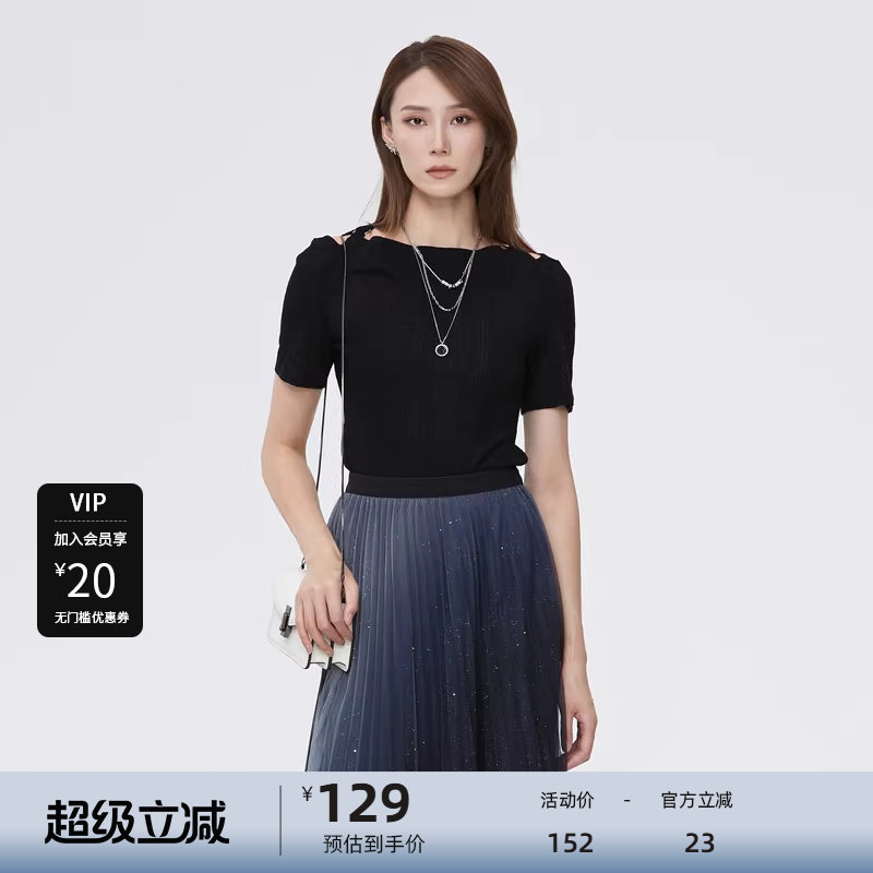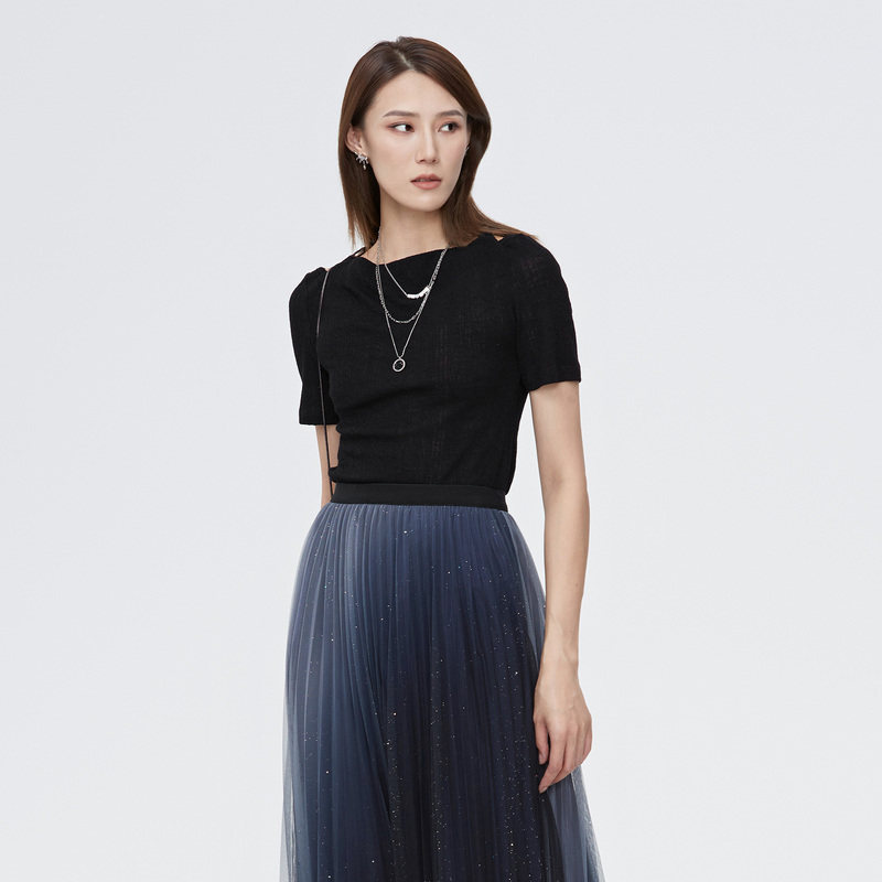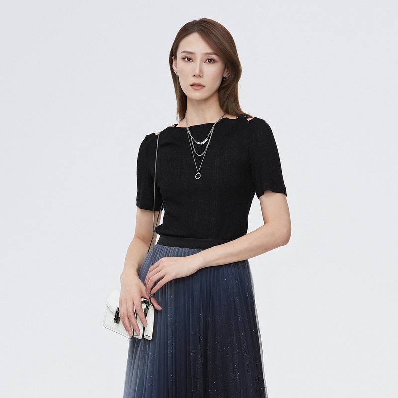 sdeer圣迪奥女装时尚圆领露肩圆环黑色短袖T恤S222Z0184