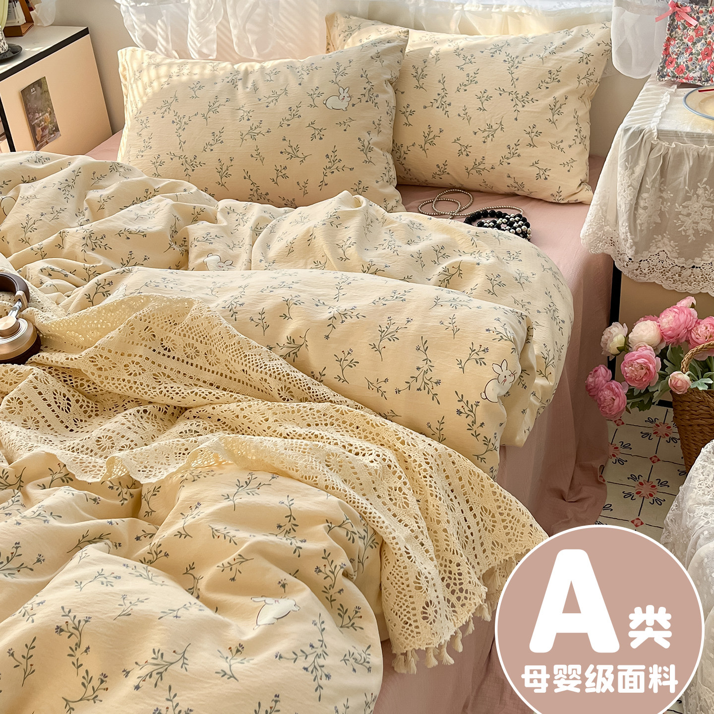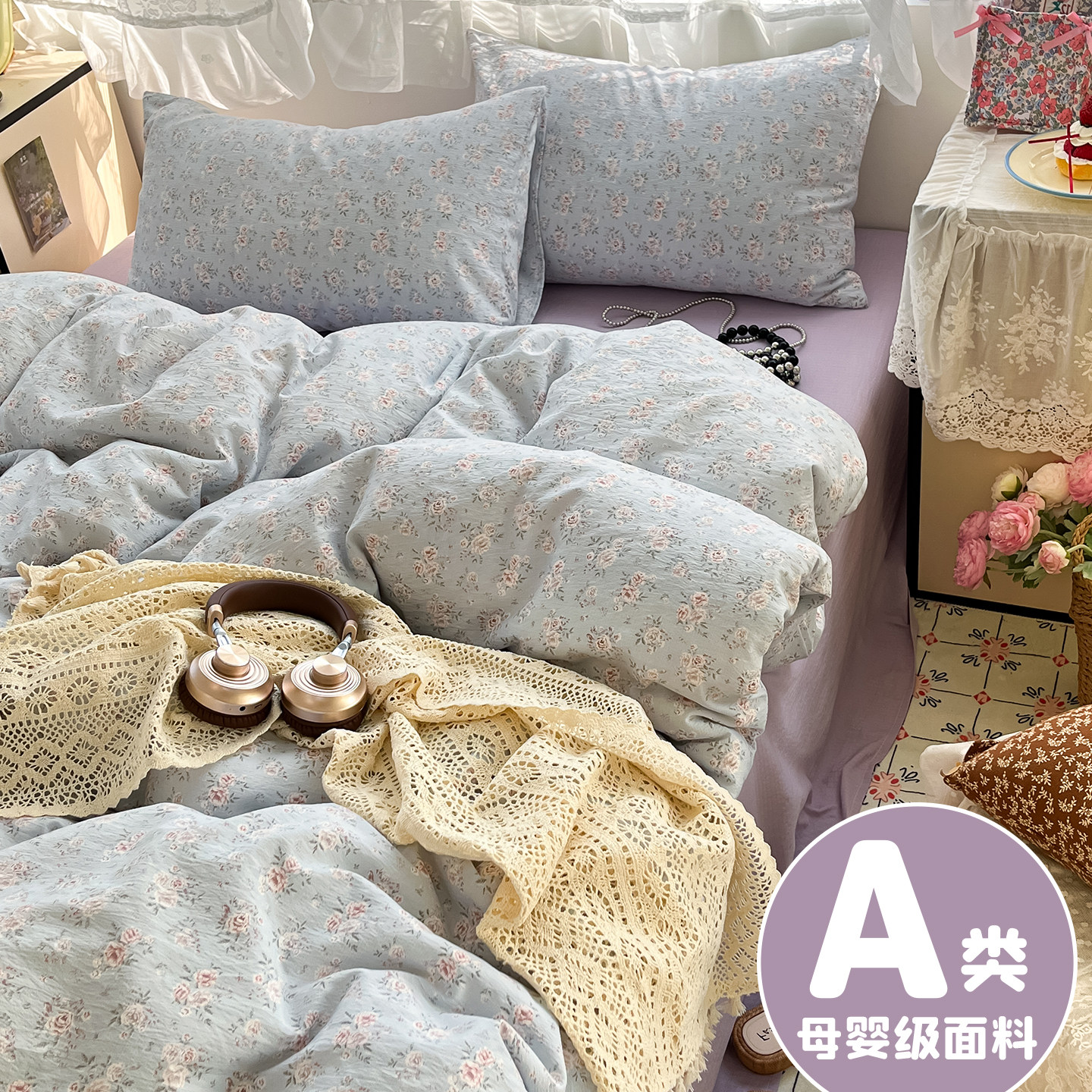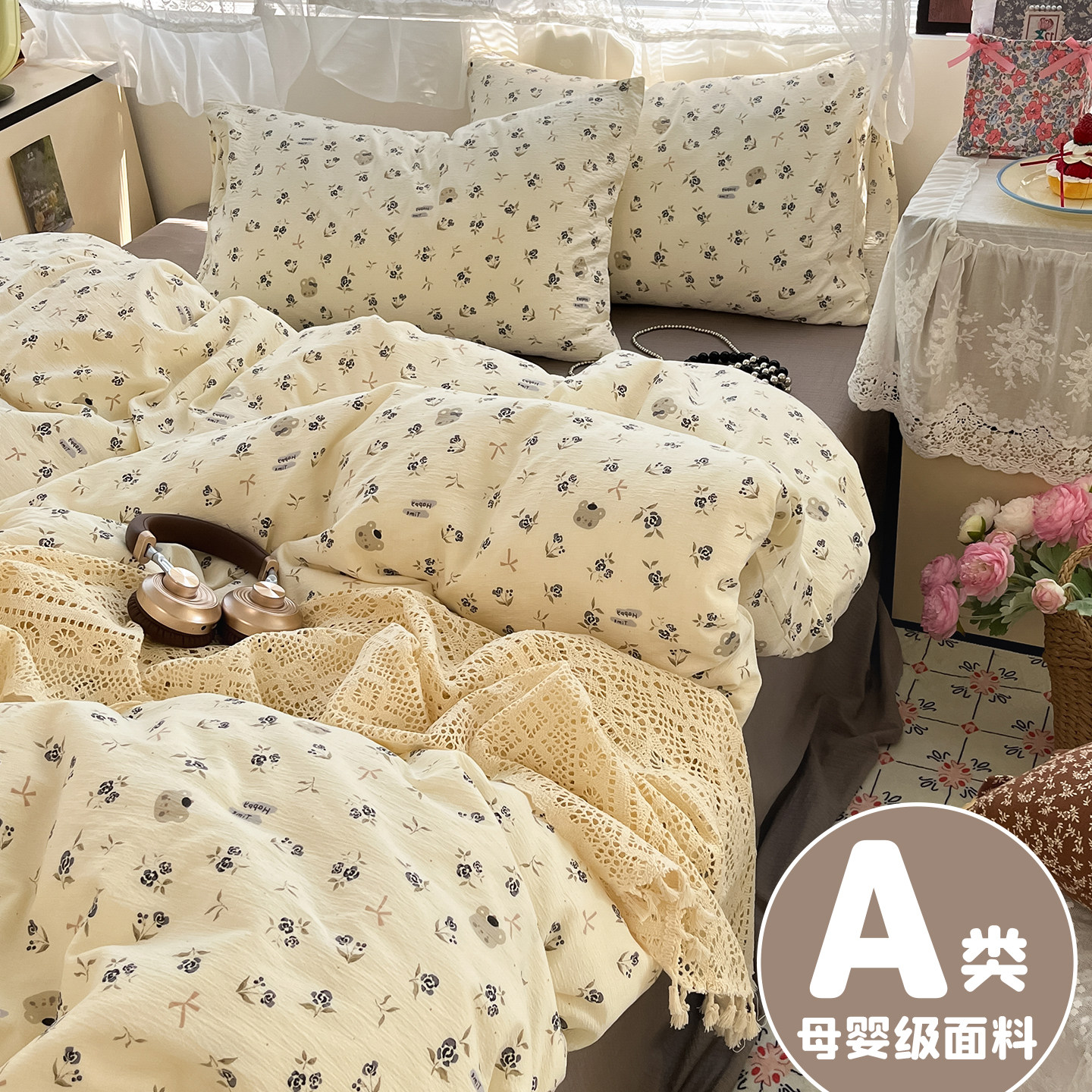 A类双层纱床上四件套纯棉全棉新款田园床单件被套被罩宿舍三件套4