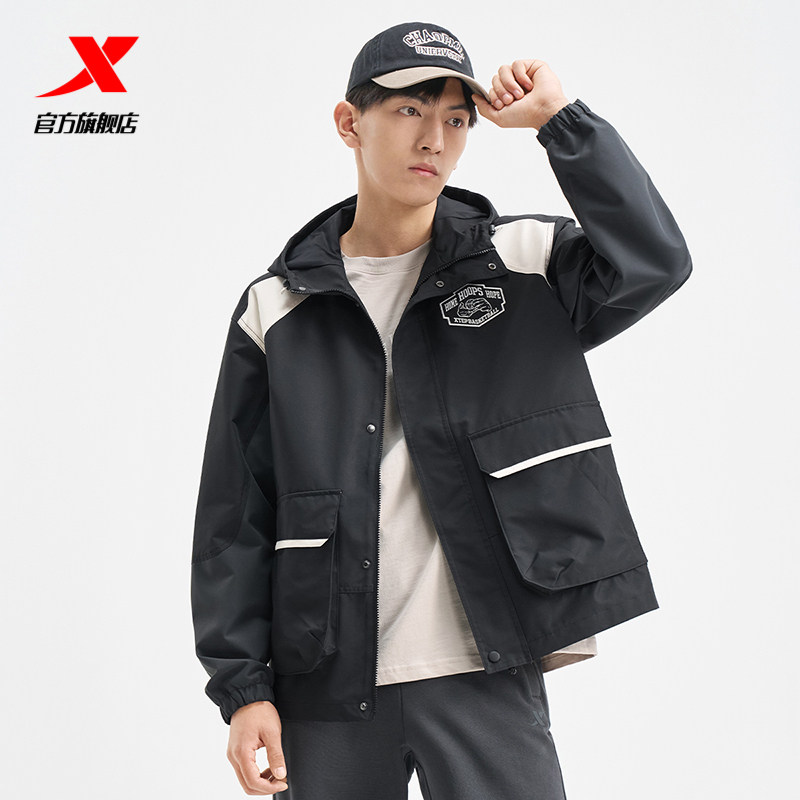 特步防泼水夹克外套男春秋季户外风衣连帽黑色上衣防风运动训练服