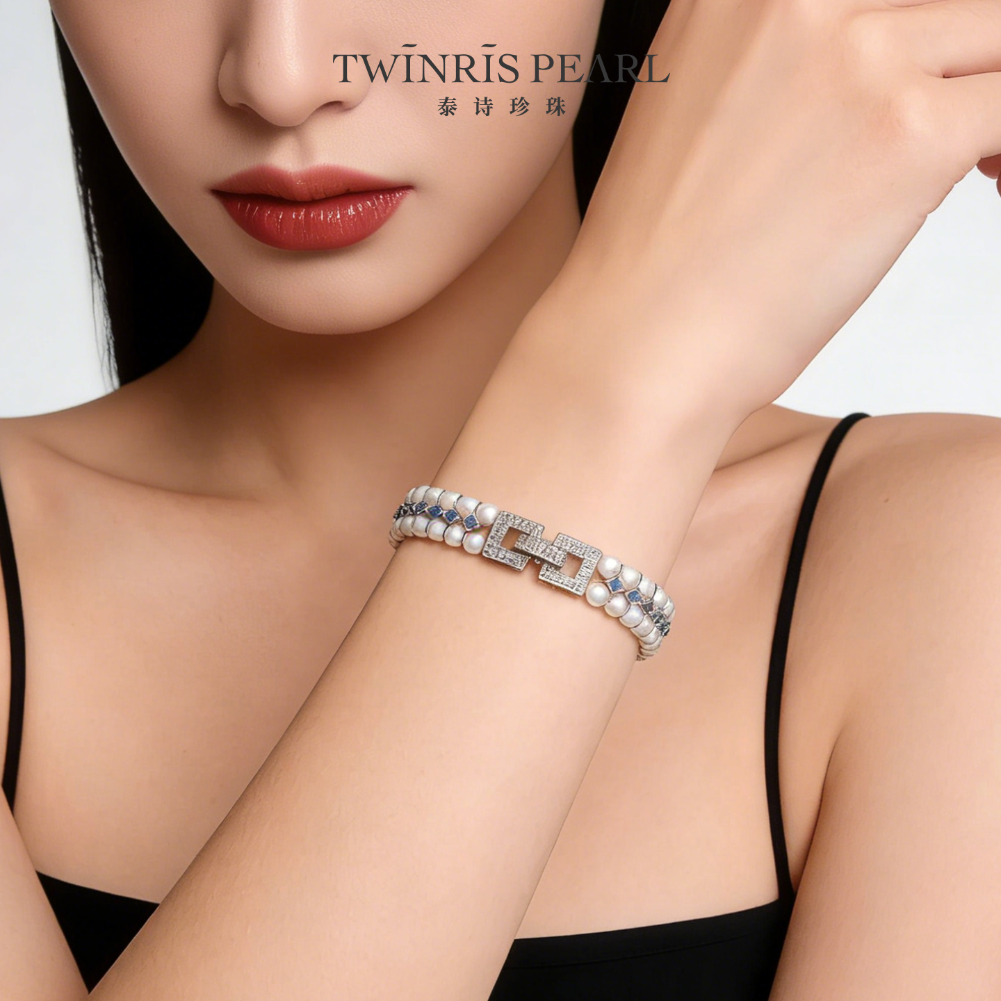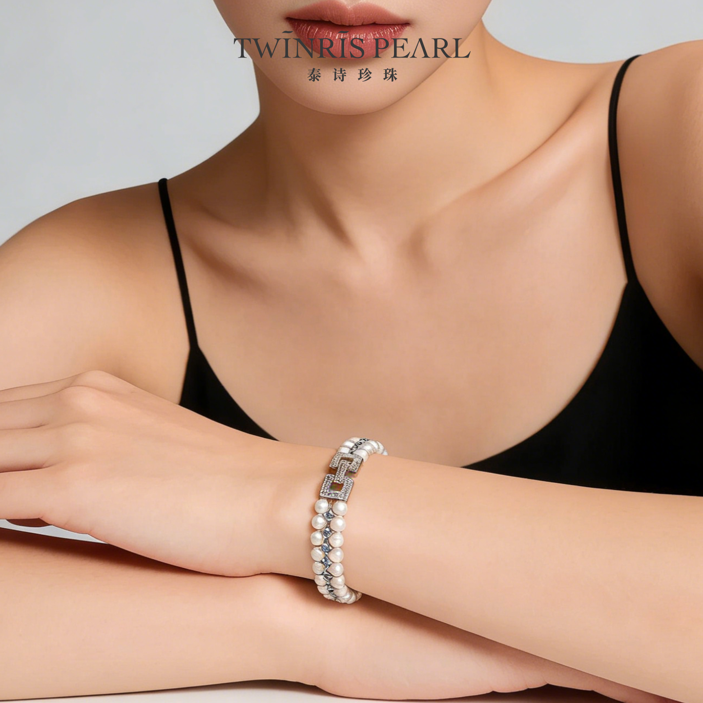 强光淡水珍珠双排8字扣双层蓝色锆石隔片手链