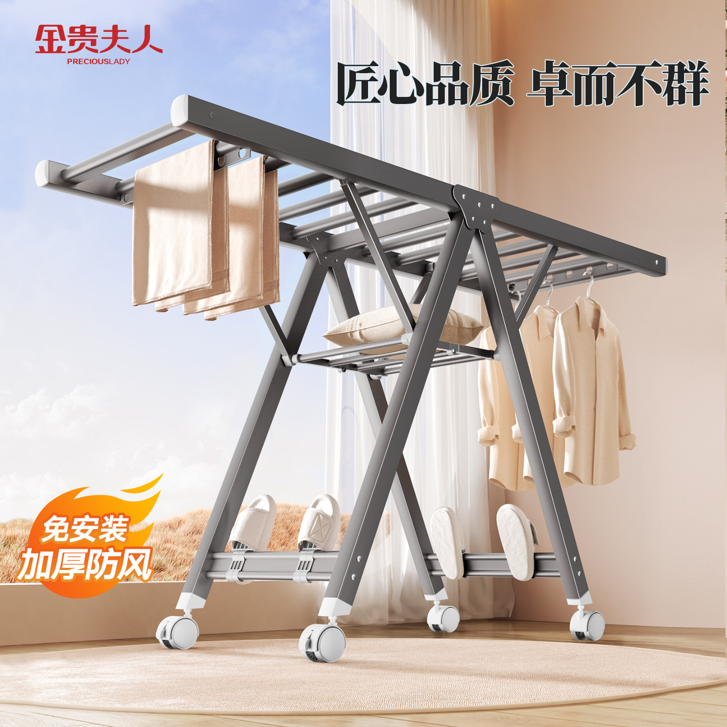 金贵夫人折叠晾衣架阳台家用铝合金落地晒衣架晾衣架子室内晒被子