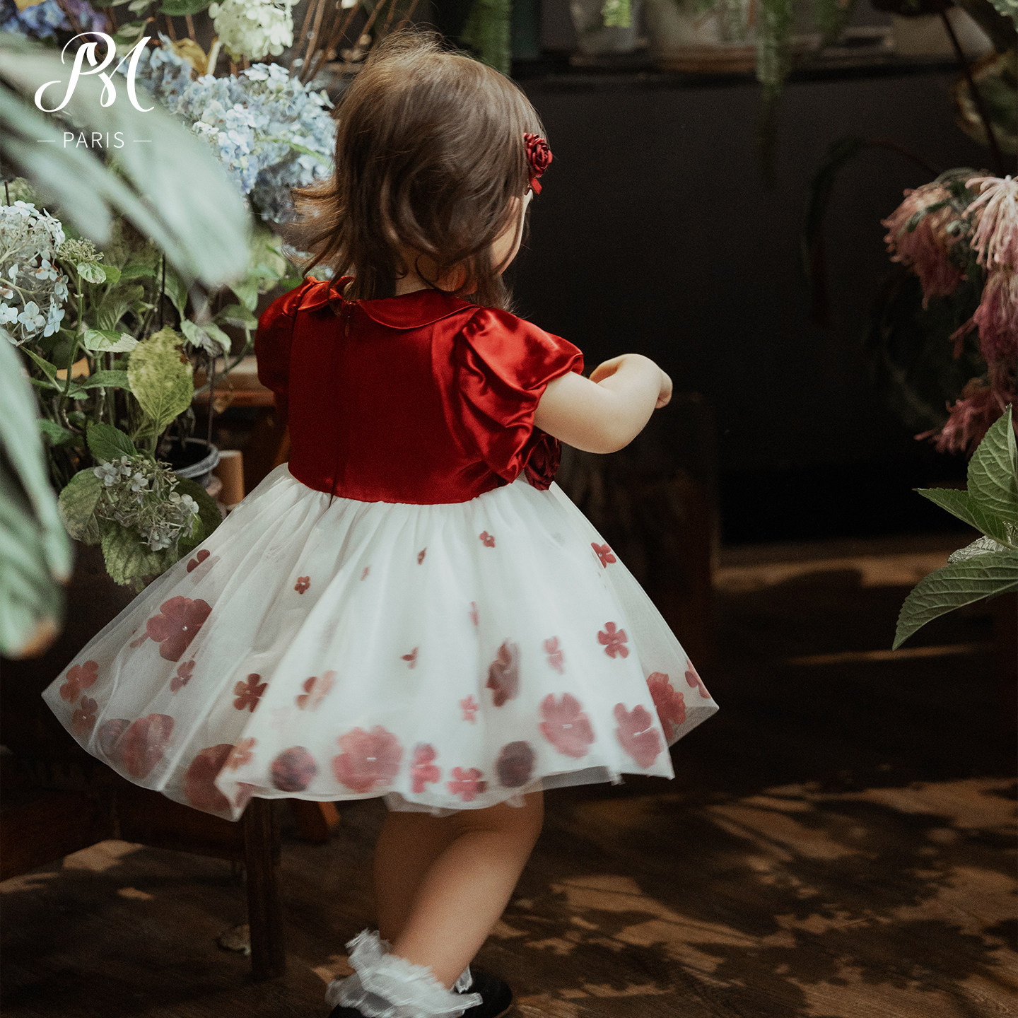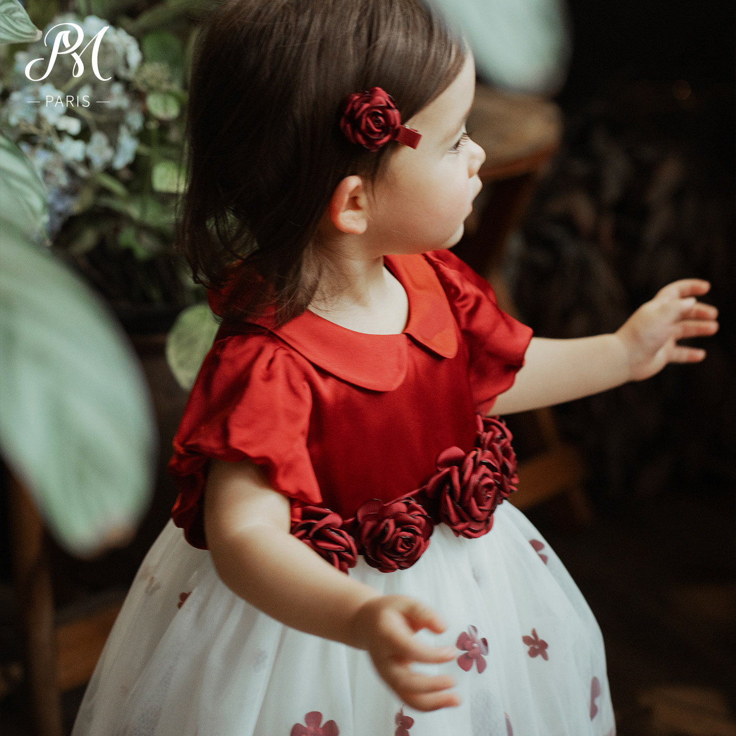 Petite Marguerite小雏菊婴童·手工钉花红色玫瑰网纱连衣裙