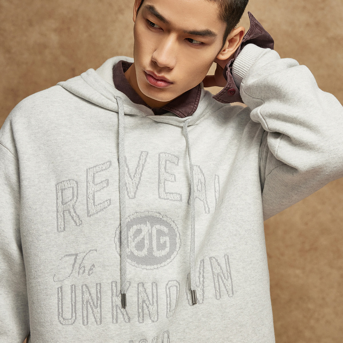 略宽松版型;衣身针织挺阔面料;抽绳连帽