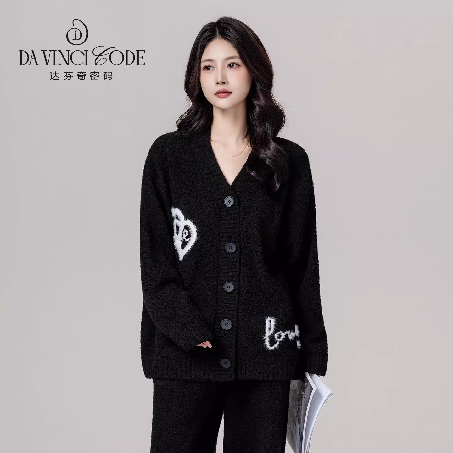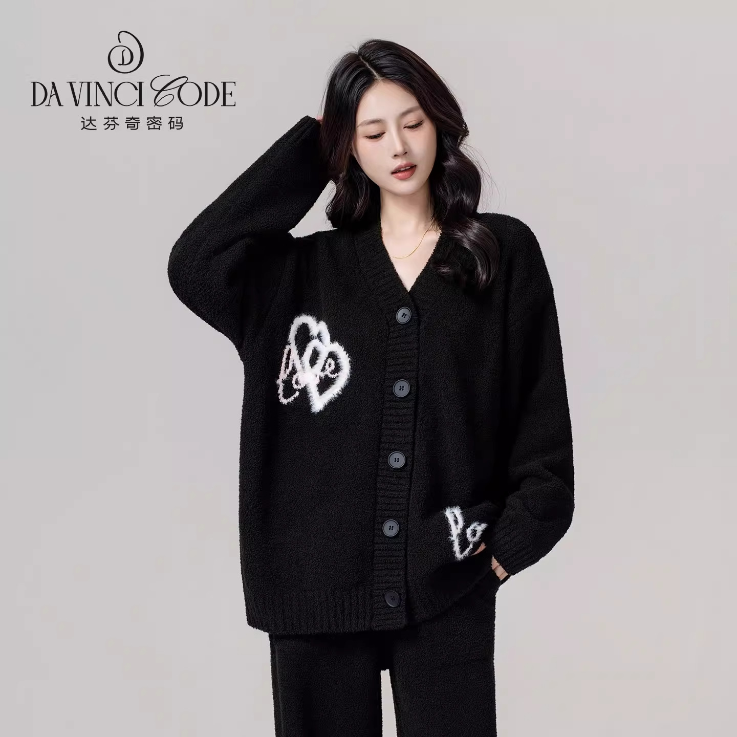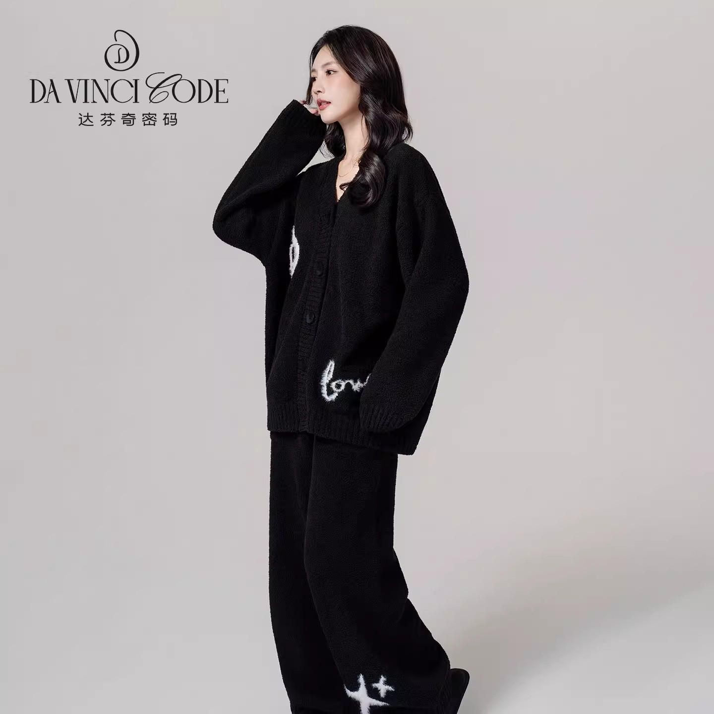达芬奇密码秋冬新款毛毛爱心半边绒加绒加厚睡衣女外穿家居服套装