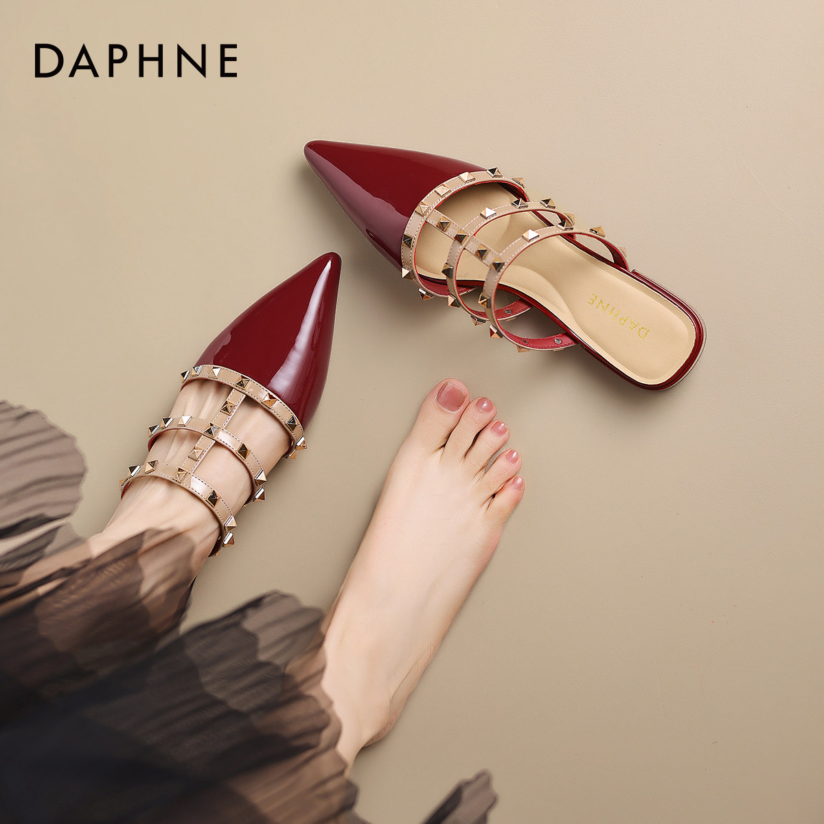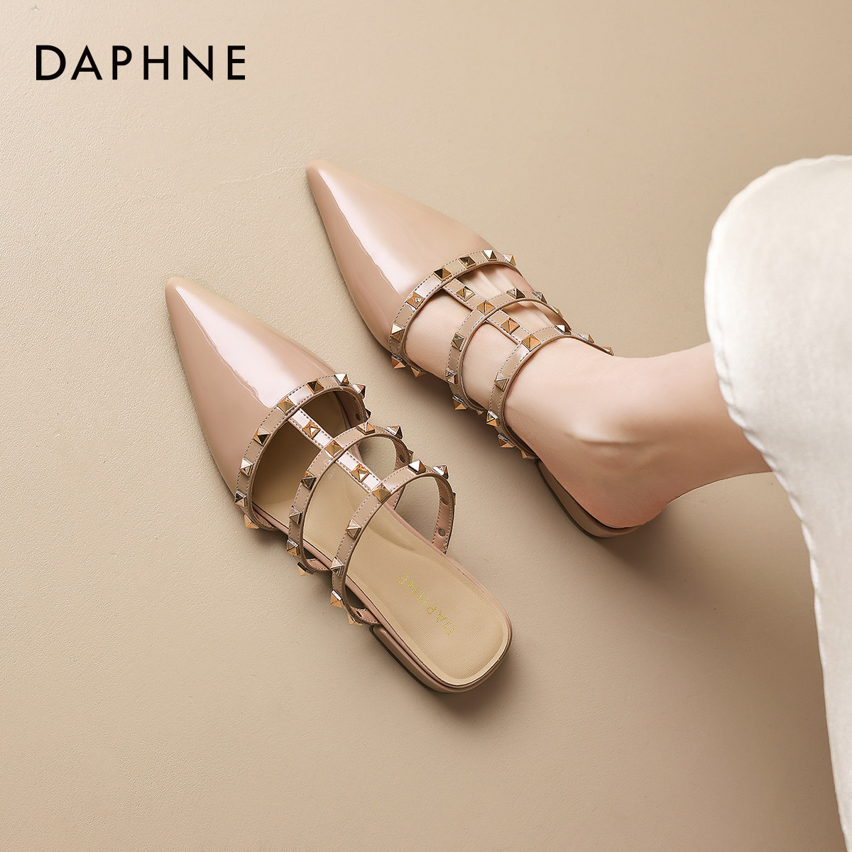 达芙妮铆钉尖头包头拖鞋女2026新款夏季优雅不累脚平底外穿半拖鞋
