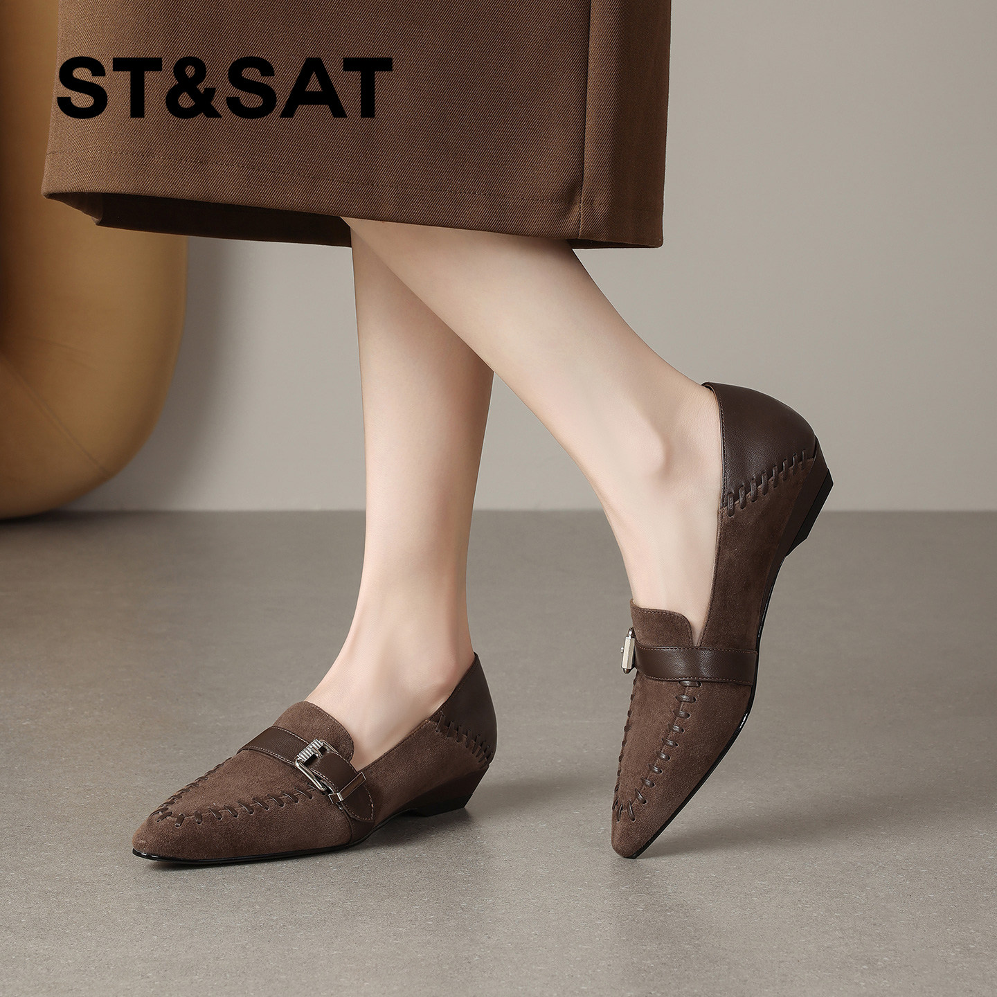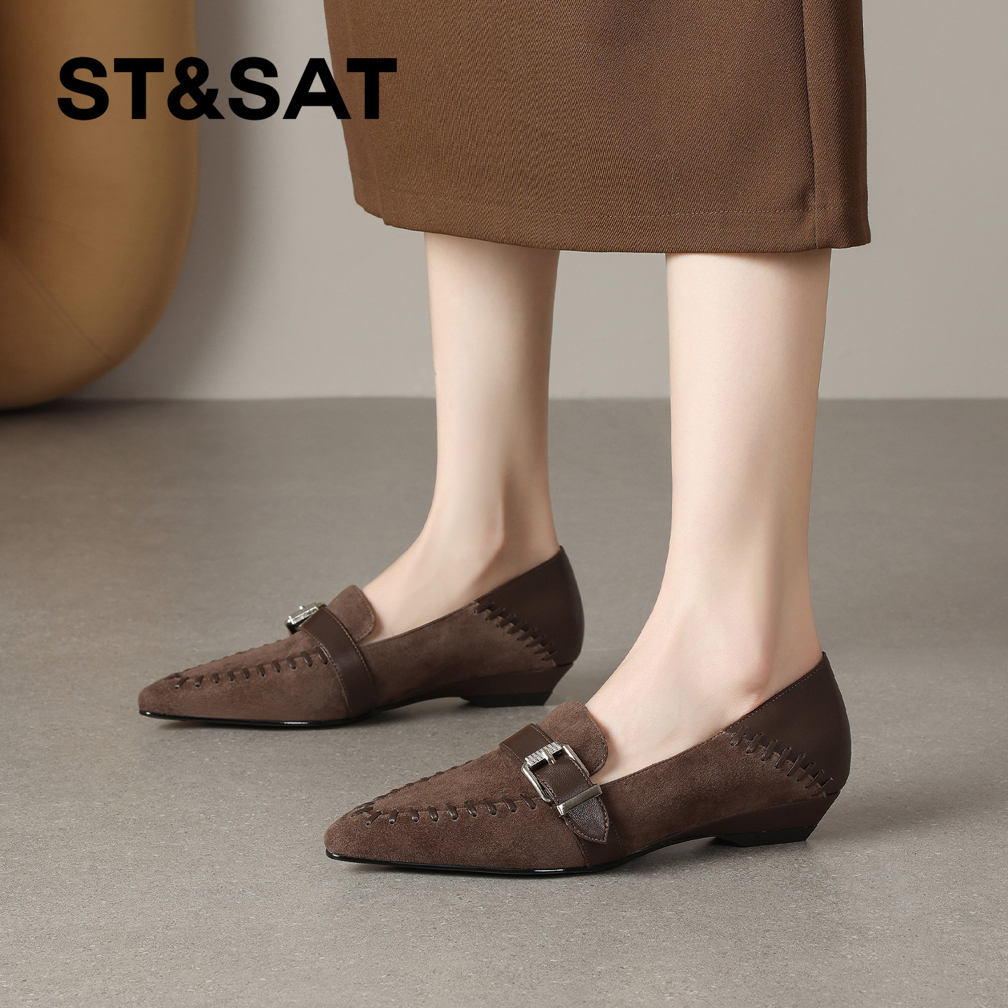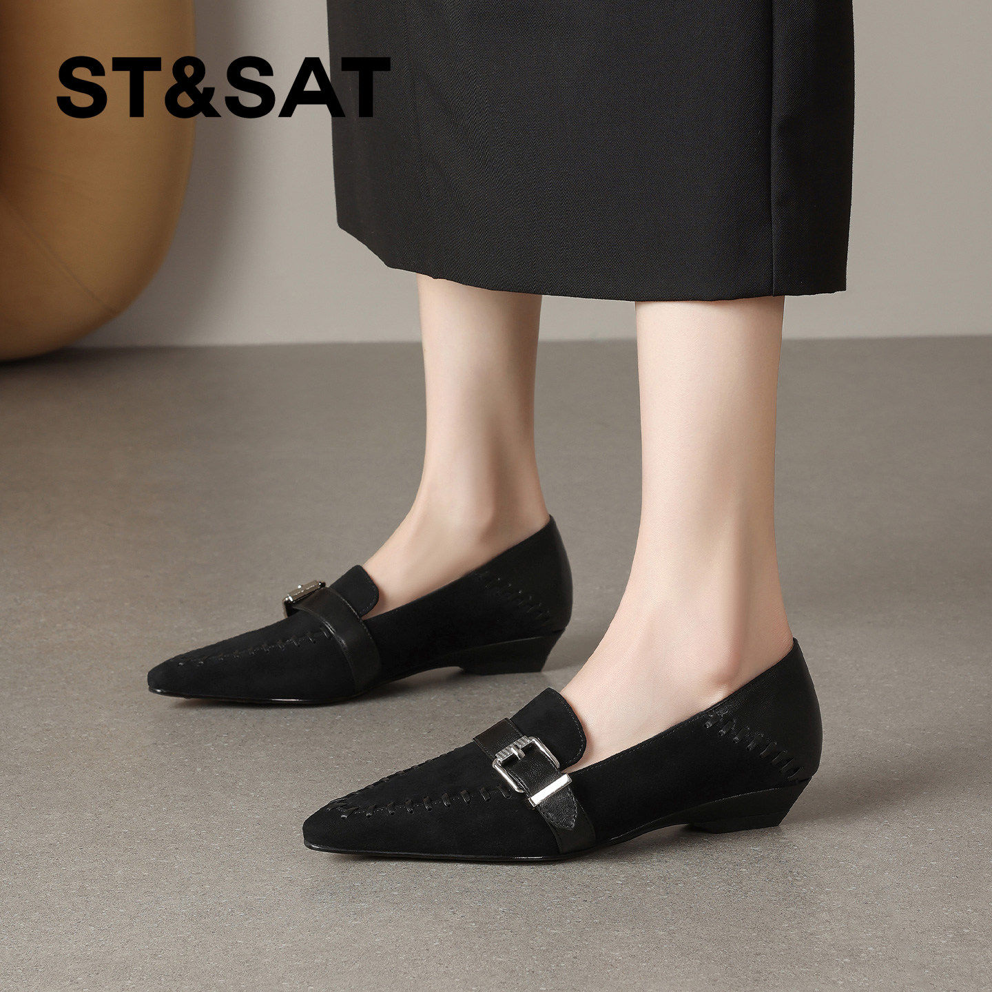星期六英伦风尖头坡跟深口单鞋女2025年春季新款拼接皮带扣通勤鞋