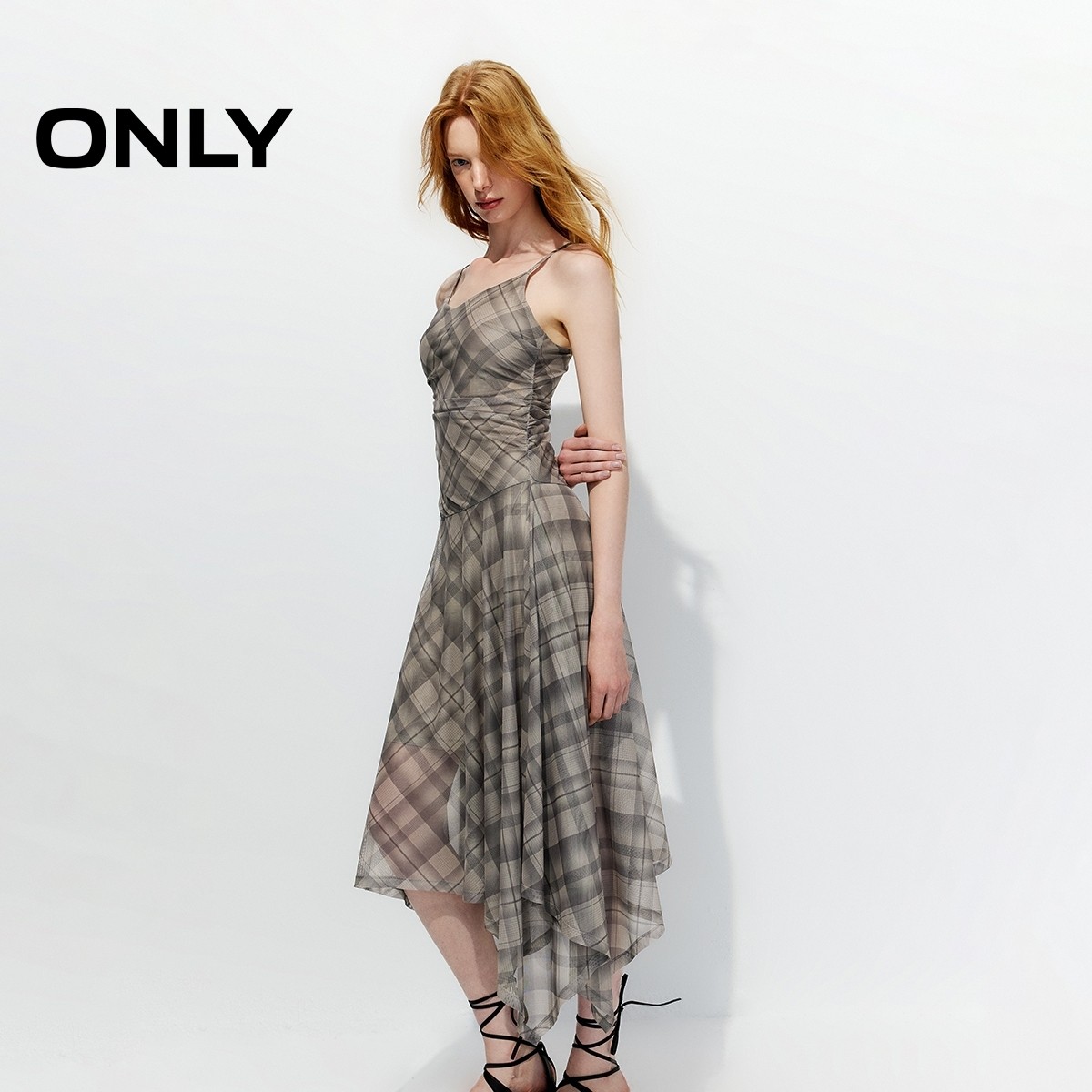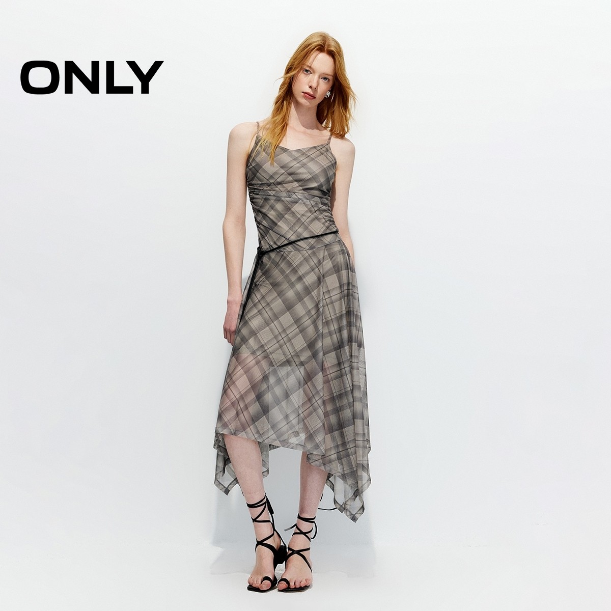 ONLY2026春季新款可调节肩带不规则格纹网纱吊带收腰裙子连衣裙