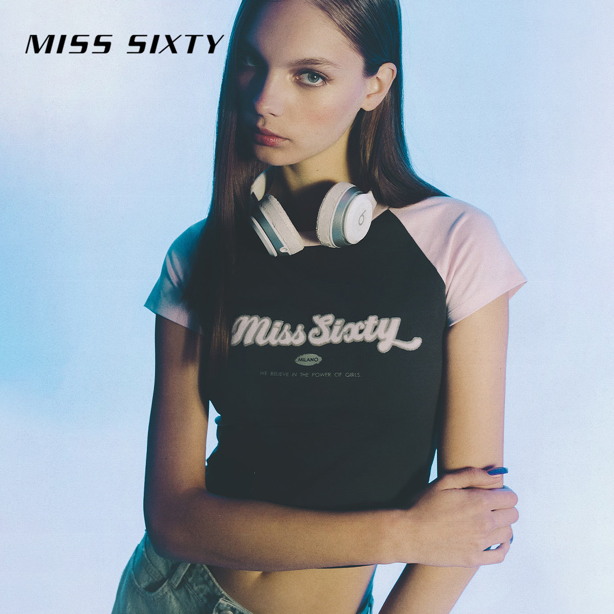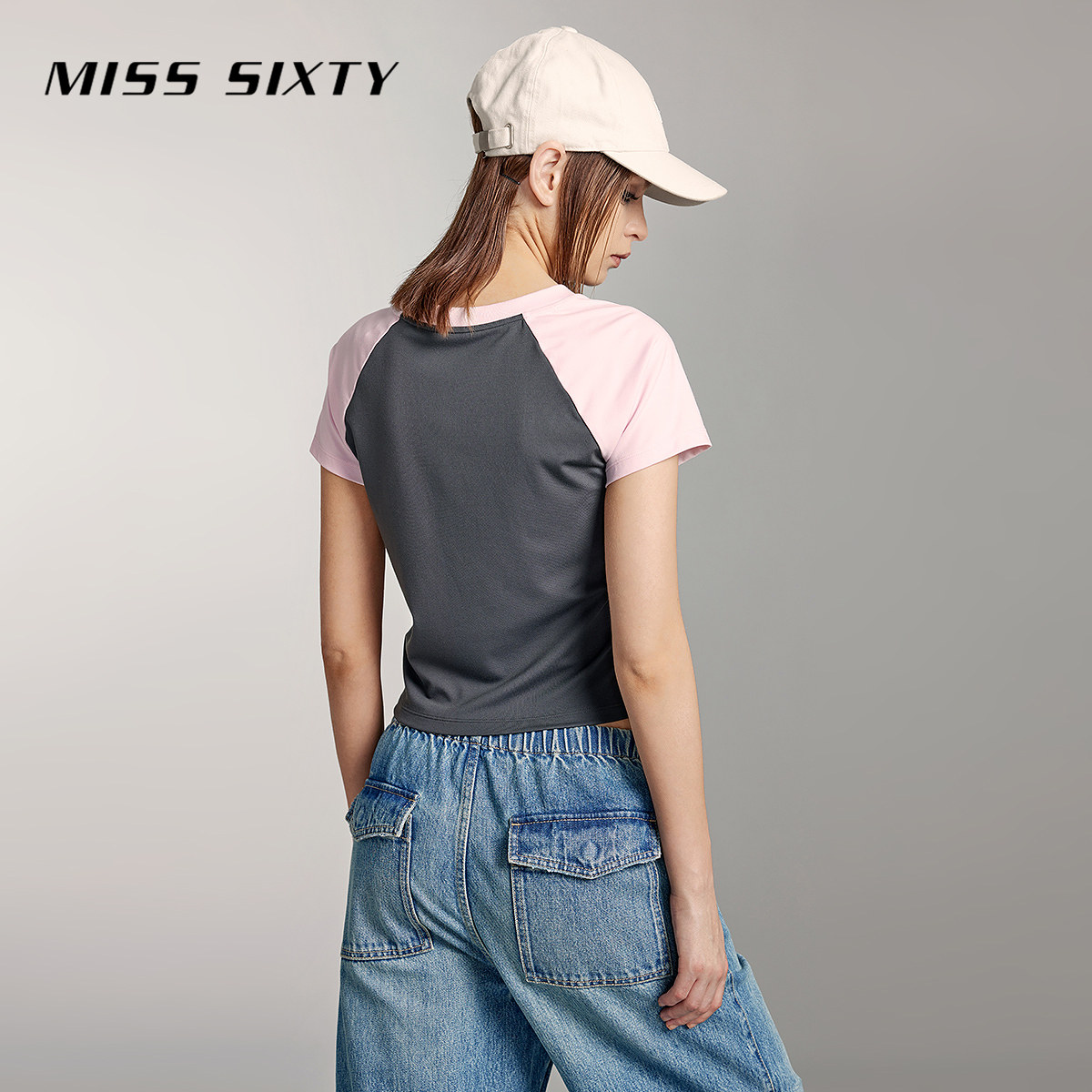 Miss Sixty短袖T恤女插肩袖美式复古运动风字母印花撞色显瘦上衣