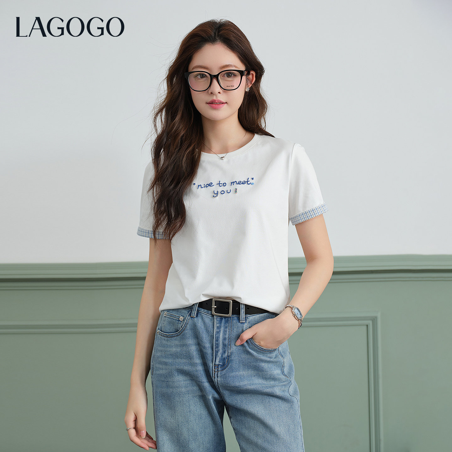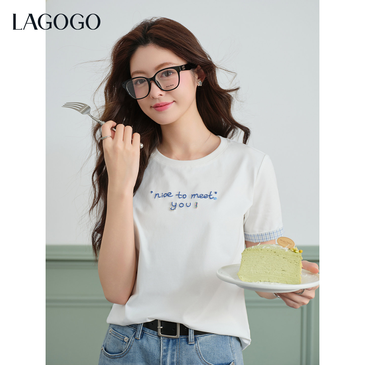 凉感抑菌LAGOGO白色短袖T恤女拉谷谷2026年夏季新款格纹绣花上衣