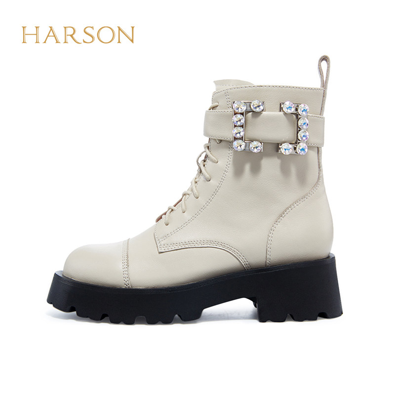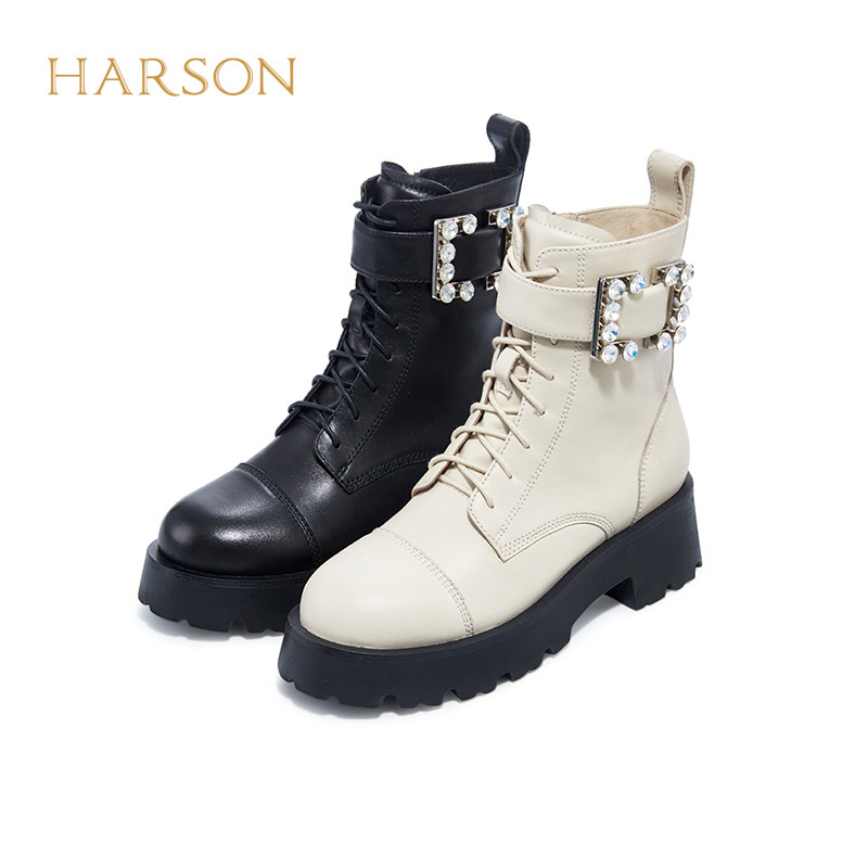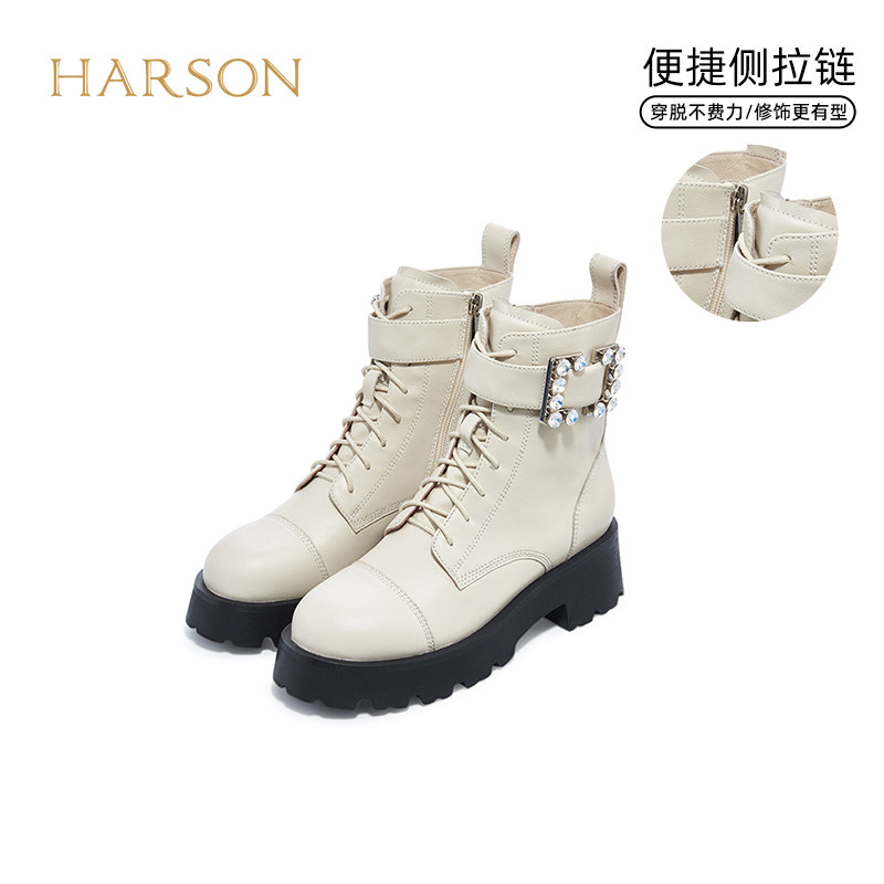 哈森春秋季新款甜酷风圆头方跟8孔马丁靴时尚短靴女HA226001