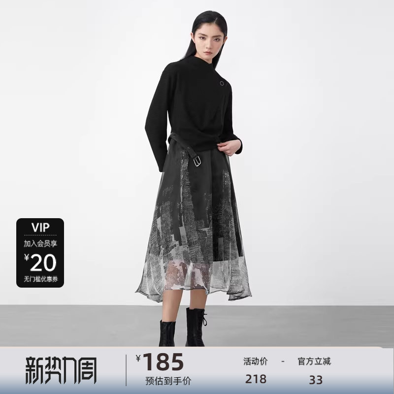 sdeer圣迪奥女装半高领印花网纱针织两件套吊带连衣裙S21481221