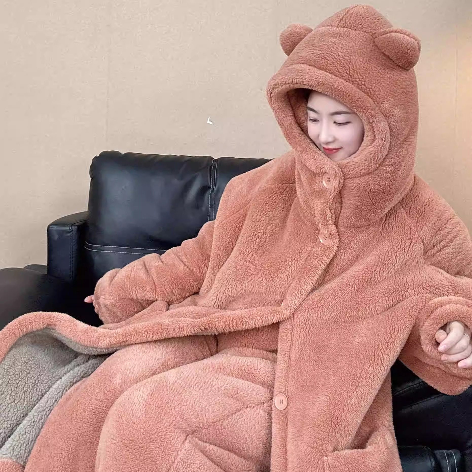 秋冬浴袍可穿浴巾女家用珊瑚绒吸水柔软速干浴裙洗澡睡袍睡衣连帽