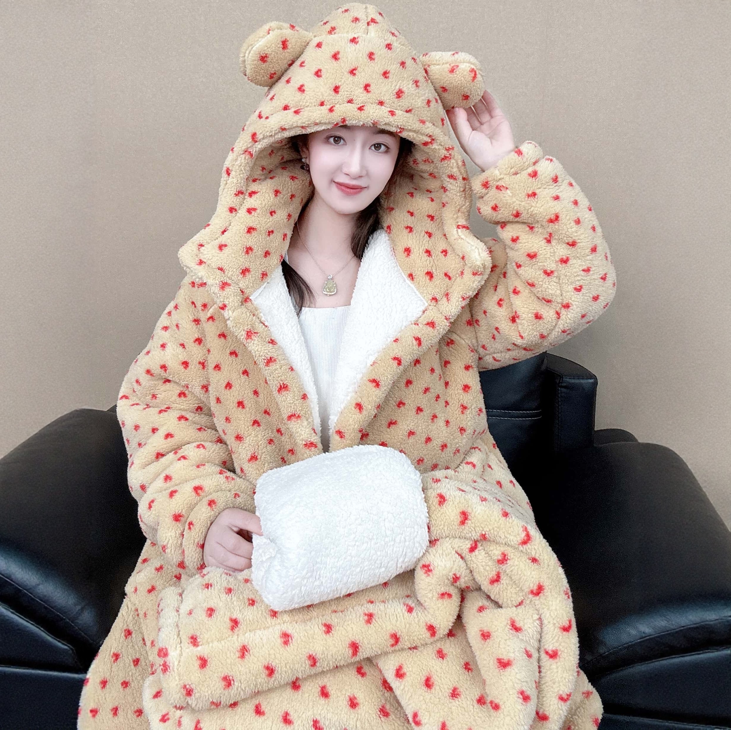 yso【酷猫系列】睡衣女秋冬新款毛绒长款连帽加厚保暖开衫睡袍D