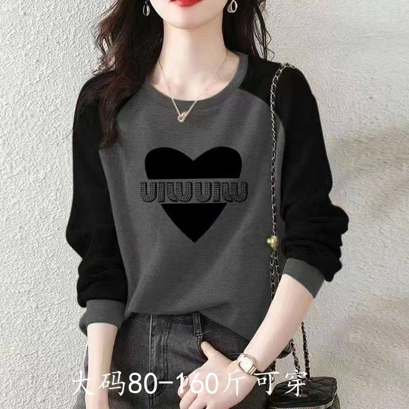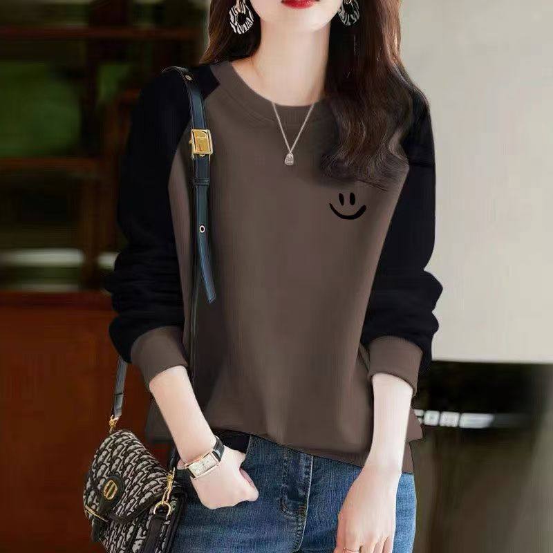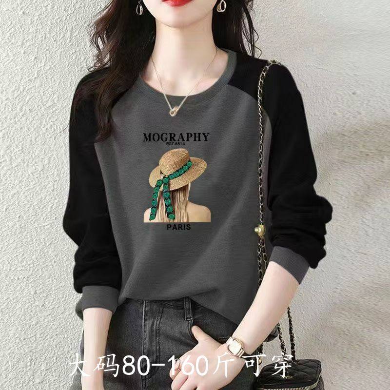 洋气拼接撞色女士t恤长袖圆领春秋新款大码宽松显瘦时尚上衣打底