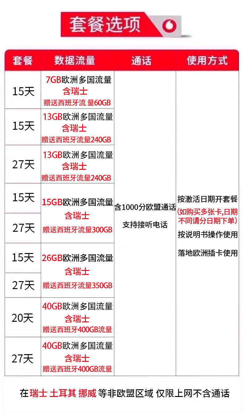 欧洲电话卡德国欧盟多国通用沃达丰4g/5g高速流量上网手机旅游卡