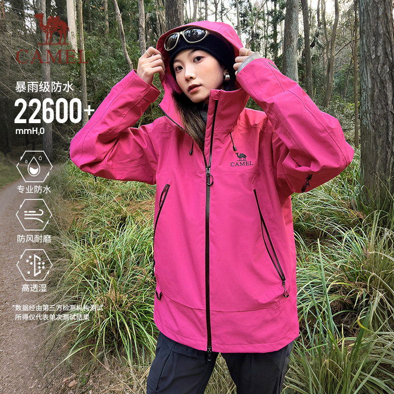 骆驼户外紫玫红色冲锋衣女暴雨防水防风外套男三合一加厚款登山服