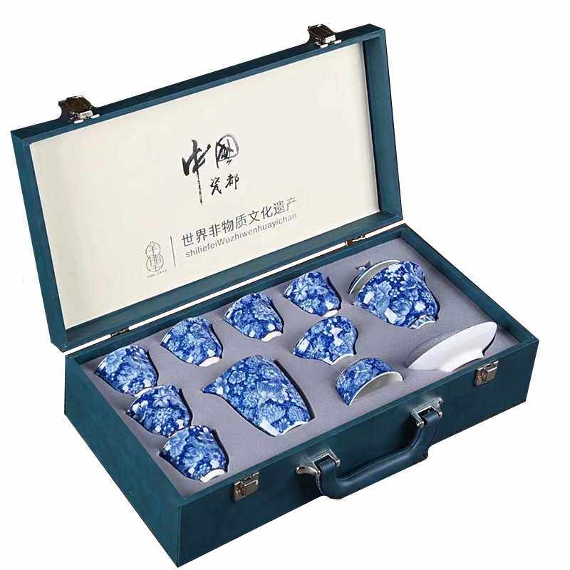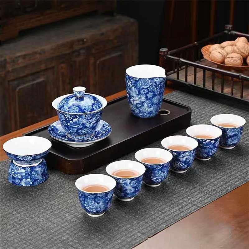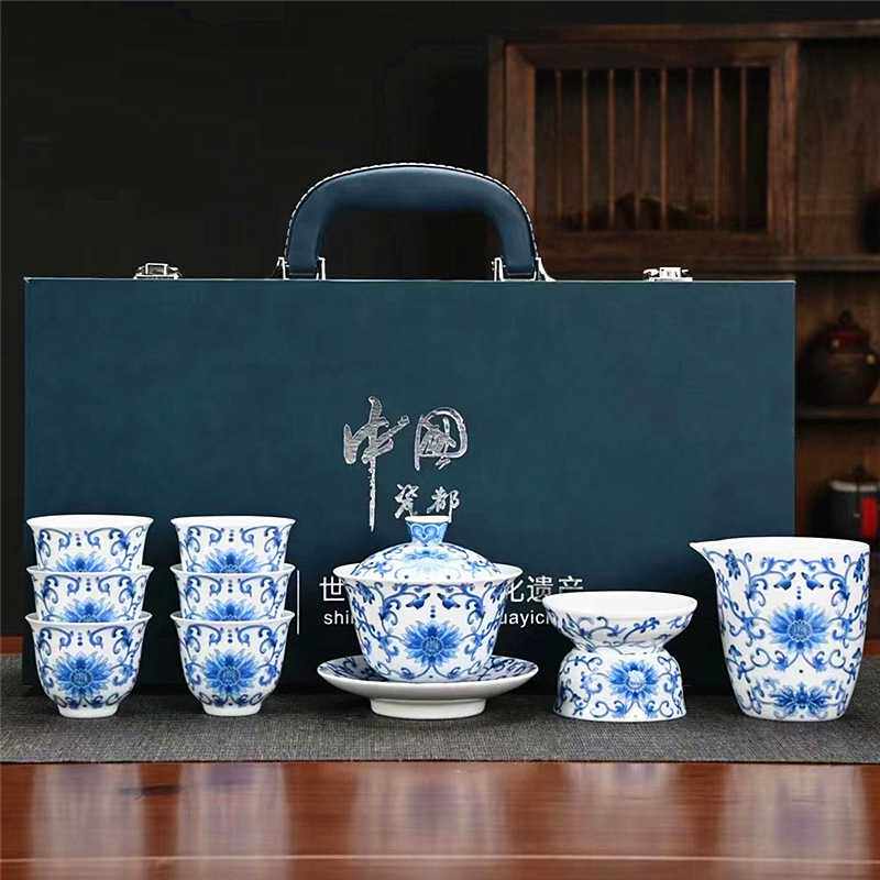 青花瓷功夫茶具套装满花釉下彩堆料陶瓷家用办公简约盖碗茶杯礼盒