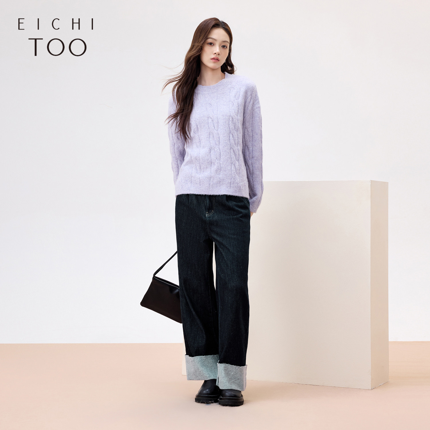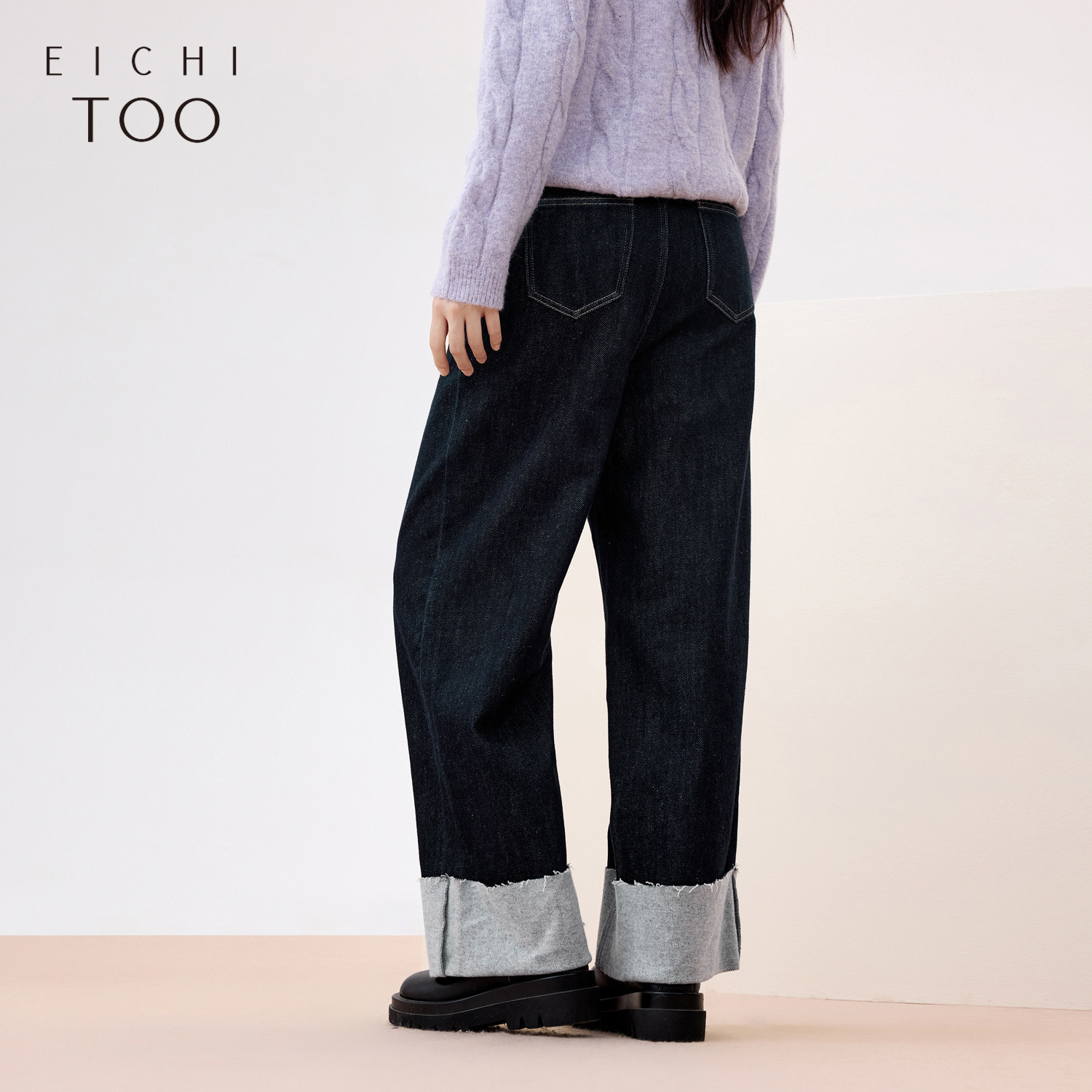 爱居兔丹宁风牛仔裤女冬季新款脚口翻边撞色加绒阔腿裤