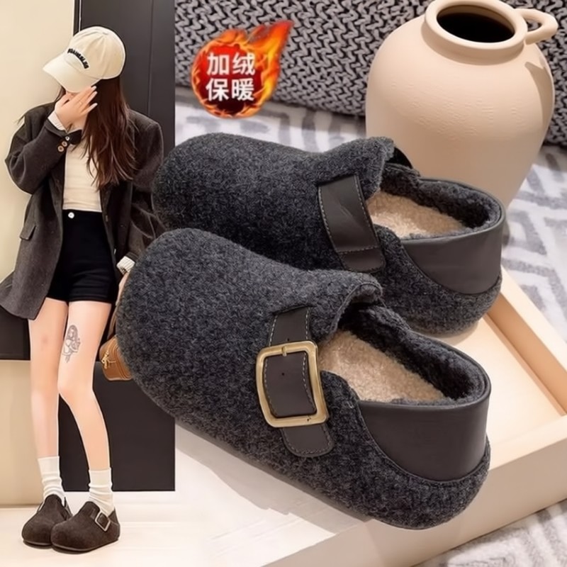 厚底毛呢勃肯鞋女外穿2025年秋冬新款百搭包头半拖鞋棉鞋平底豆豆