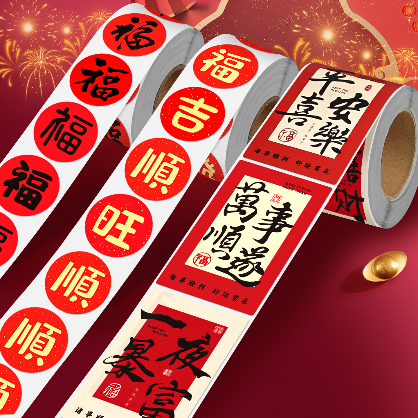 中国风封口贴纸文字祝福语高颜值ins风新年快乐暴富烘焙装饰小图案飞机盒打包装礼盒不干胶标签纸过年贴画D1