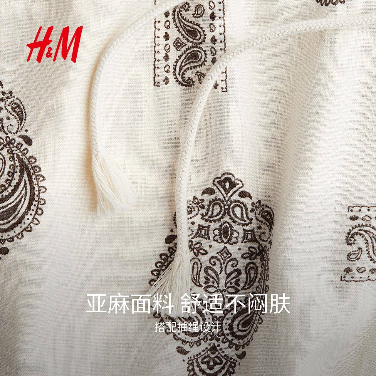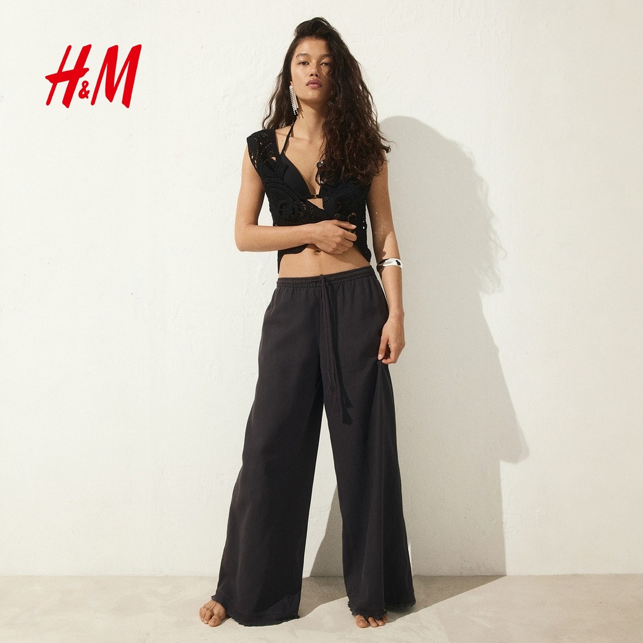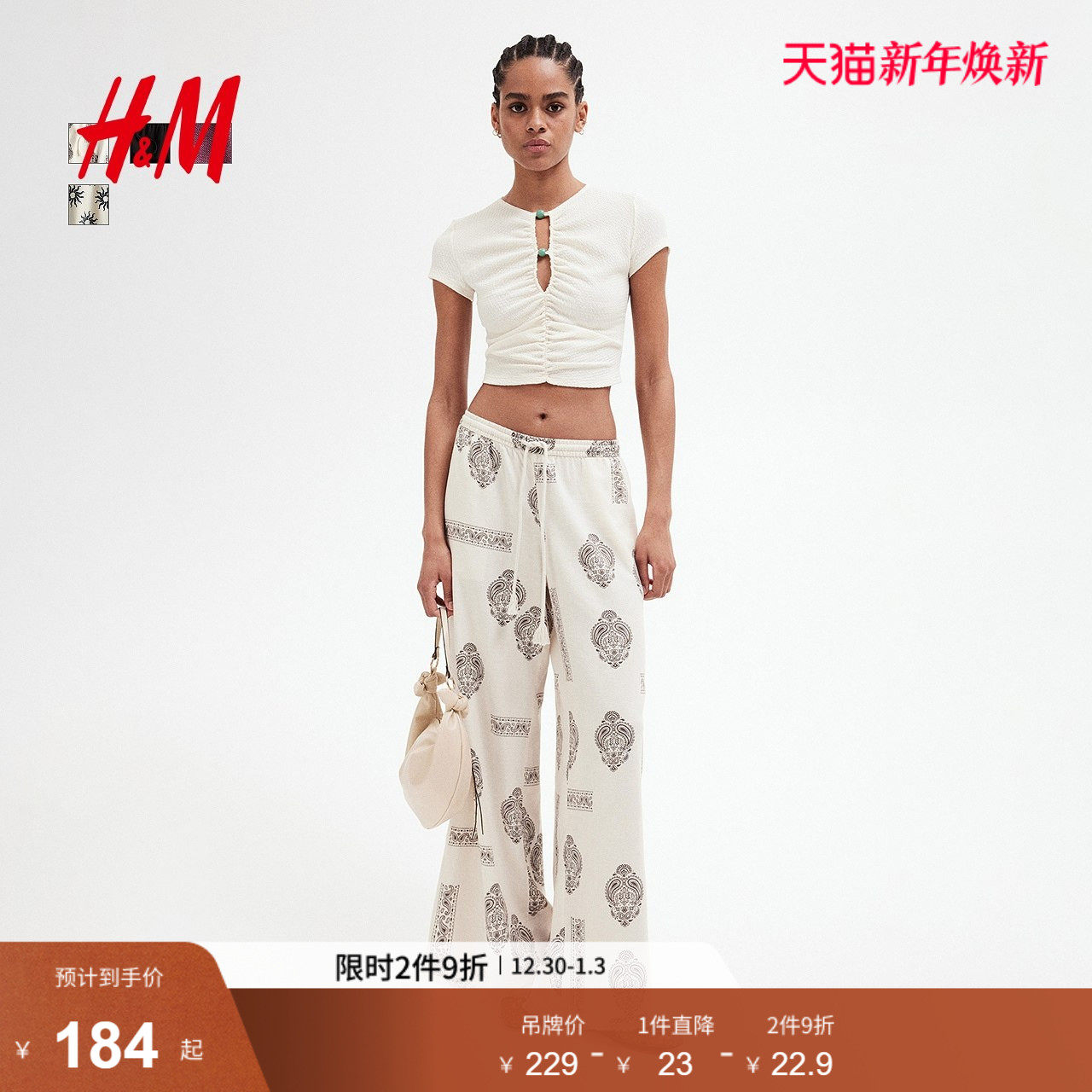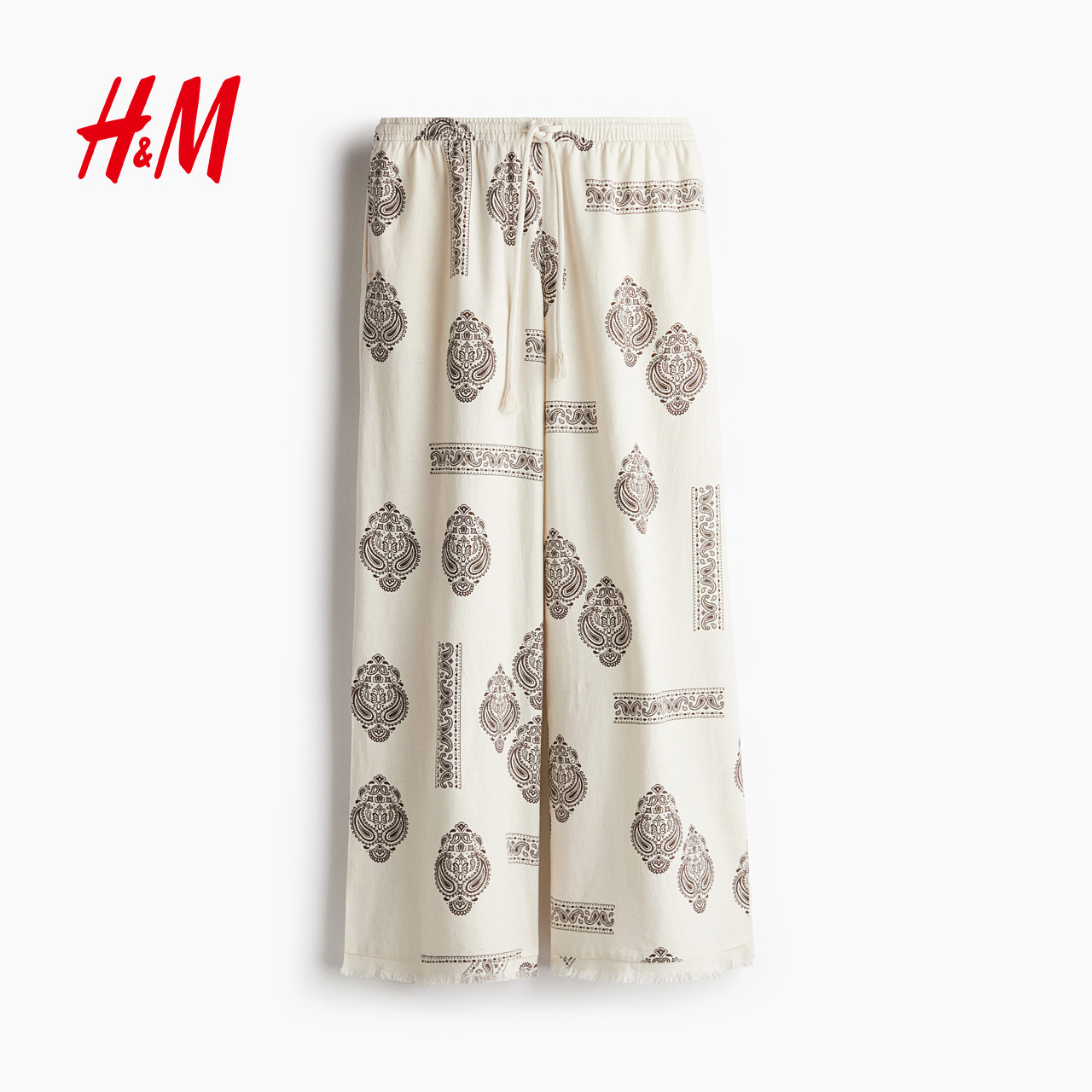HM女装休闲裤冬季洋气亚麻混纺阔腿波嬉风穿搭抽绳长裤1262025
