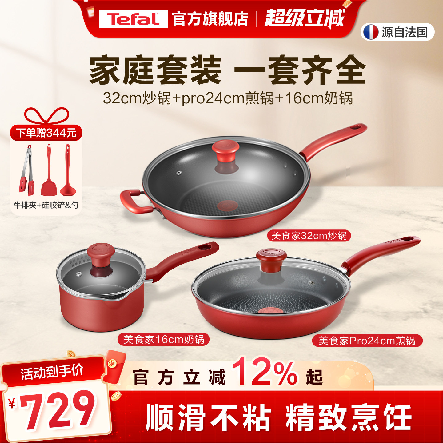Tefal/特福不粘锅家用炒锅煎锅奶锅组合三件套不挑炉灶套装