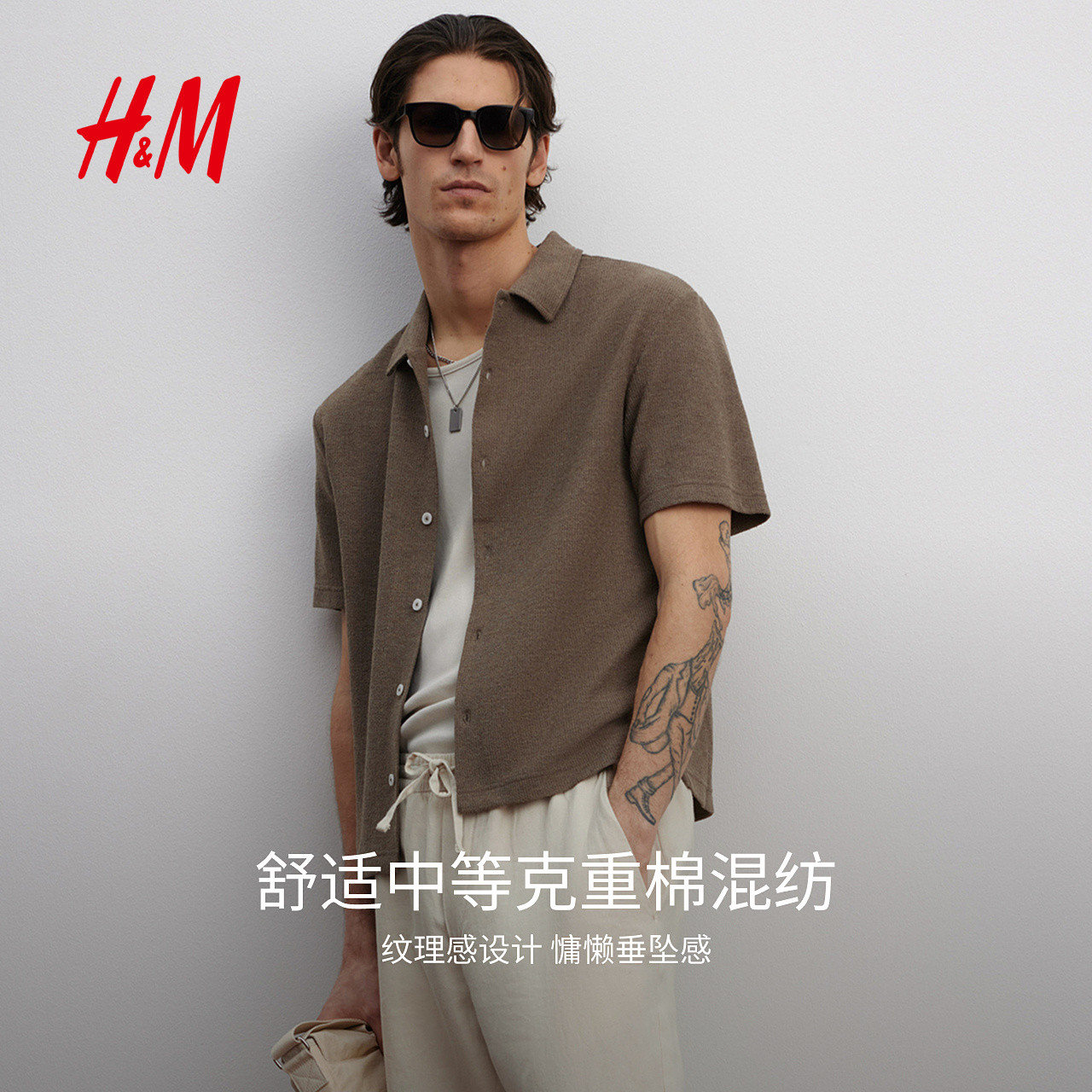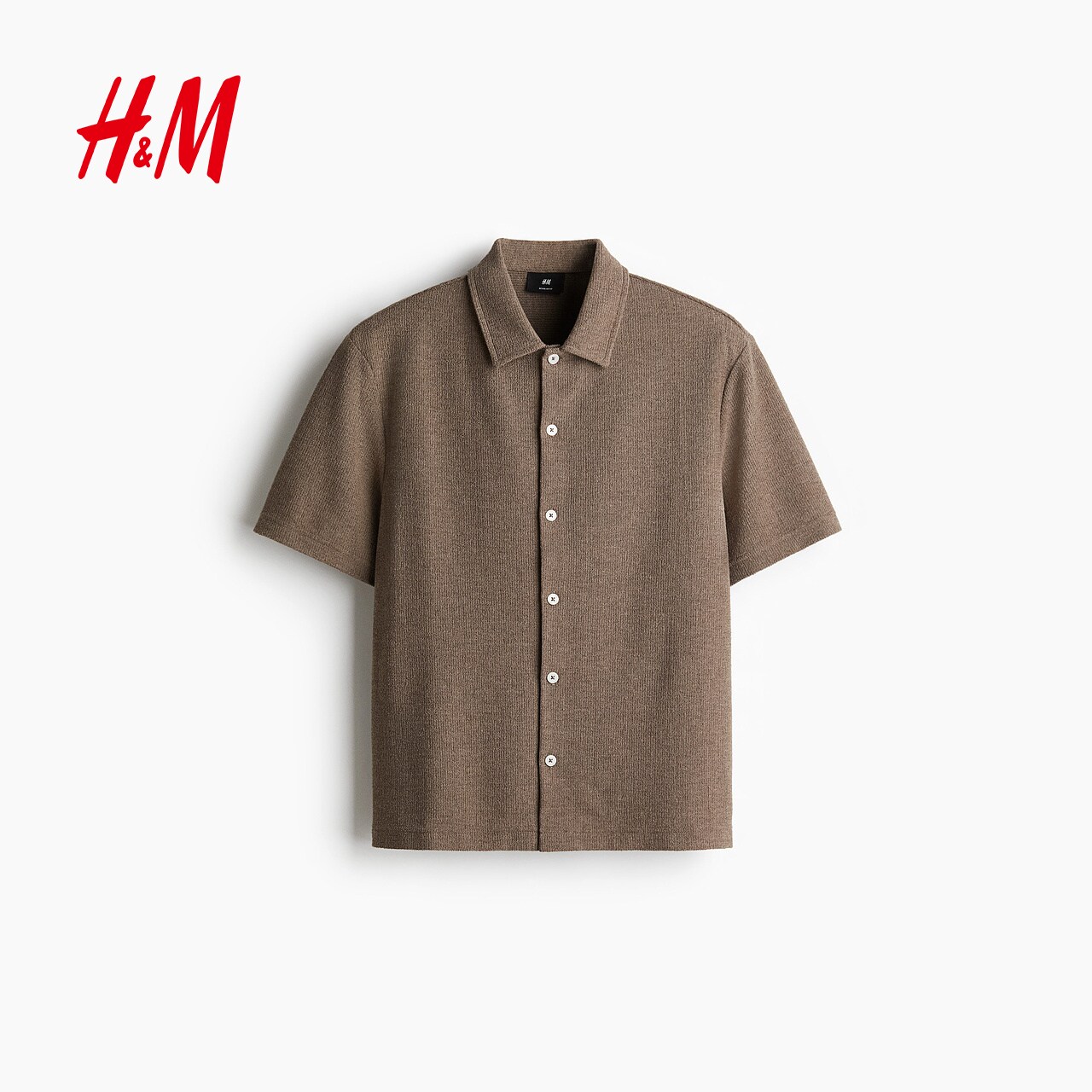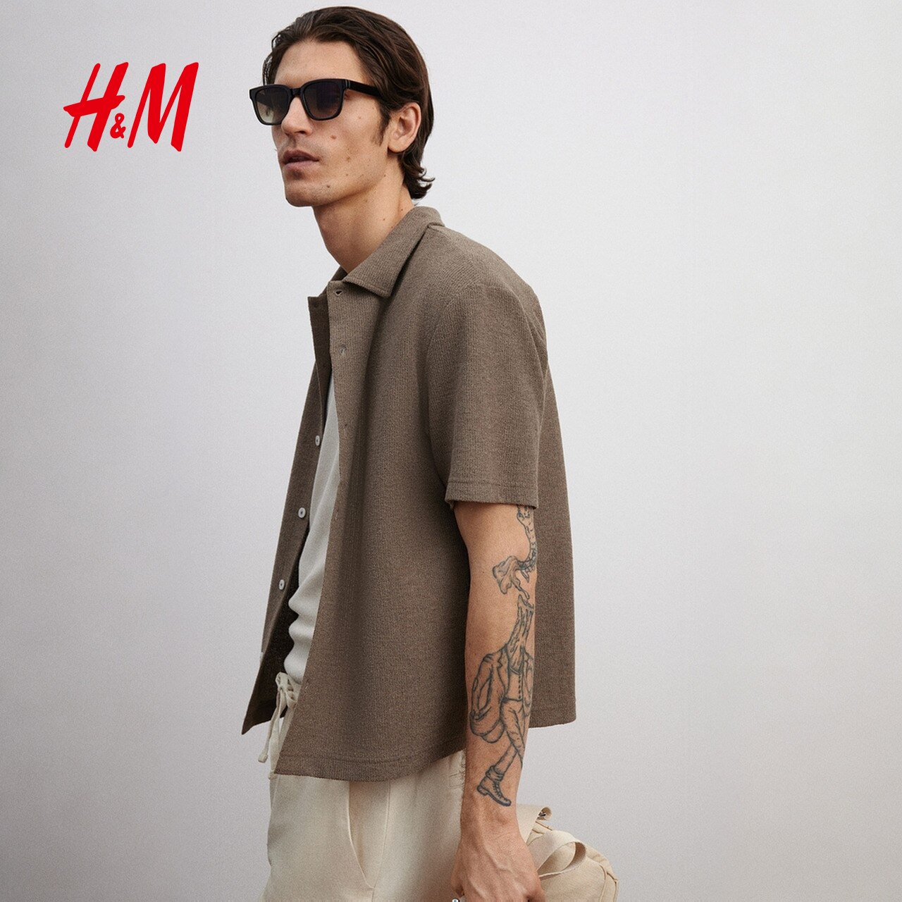 HM男装衬衫春季休闲纹理感翻领短袖舒适法式衬衣1229117