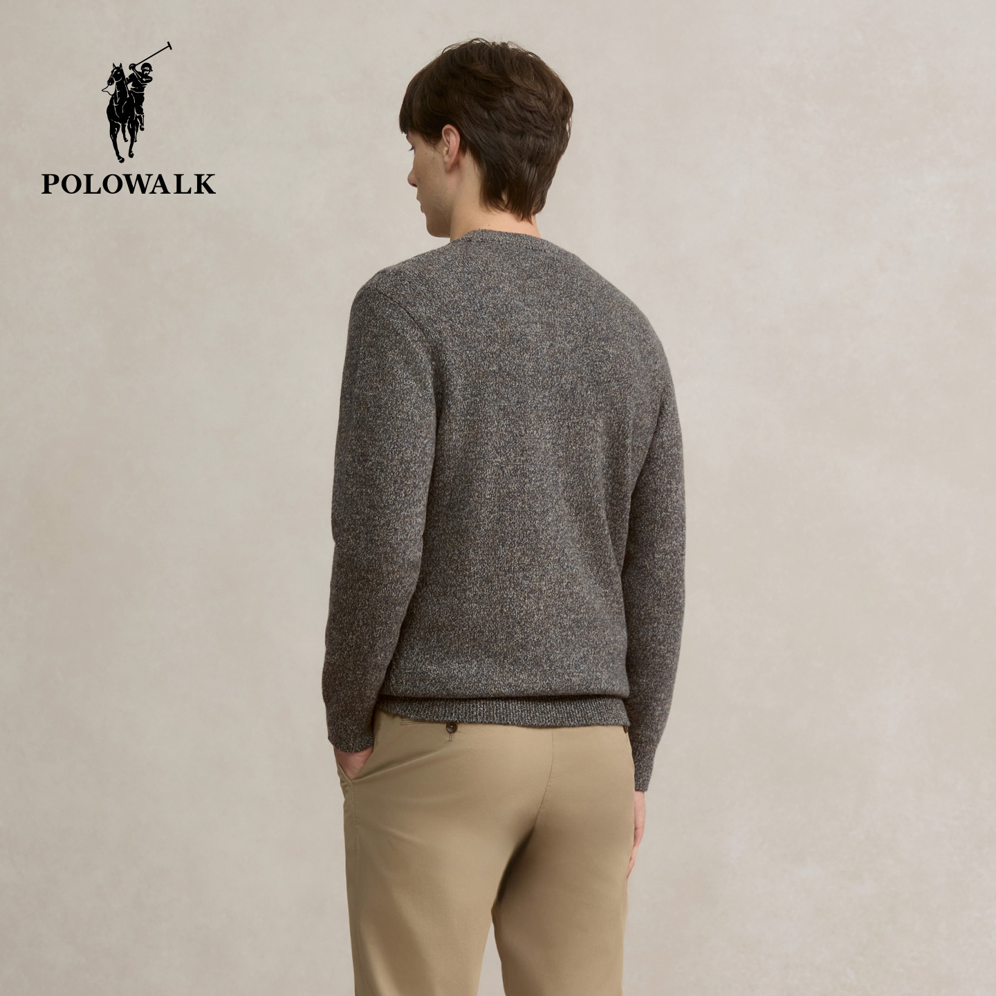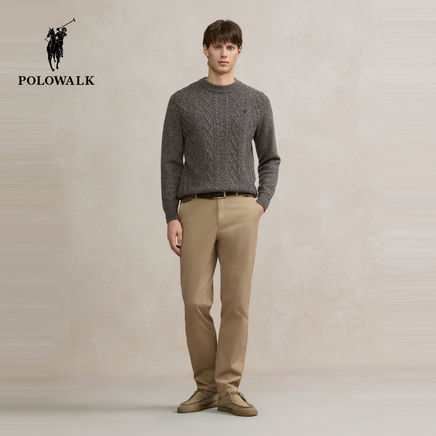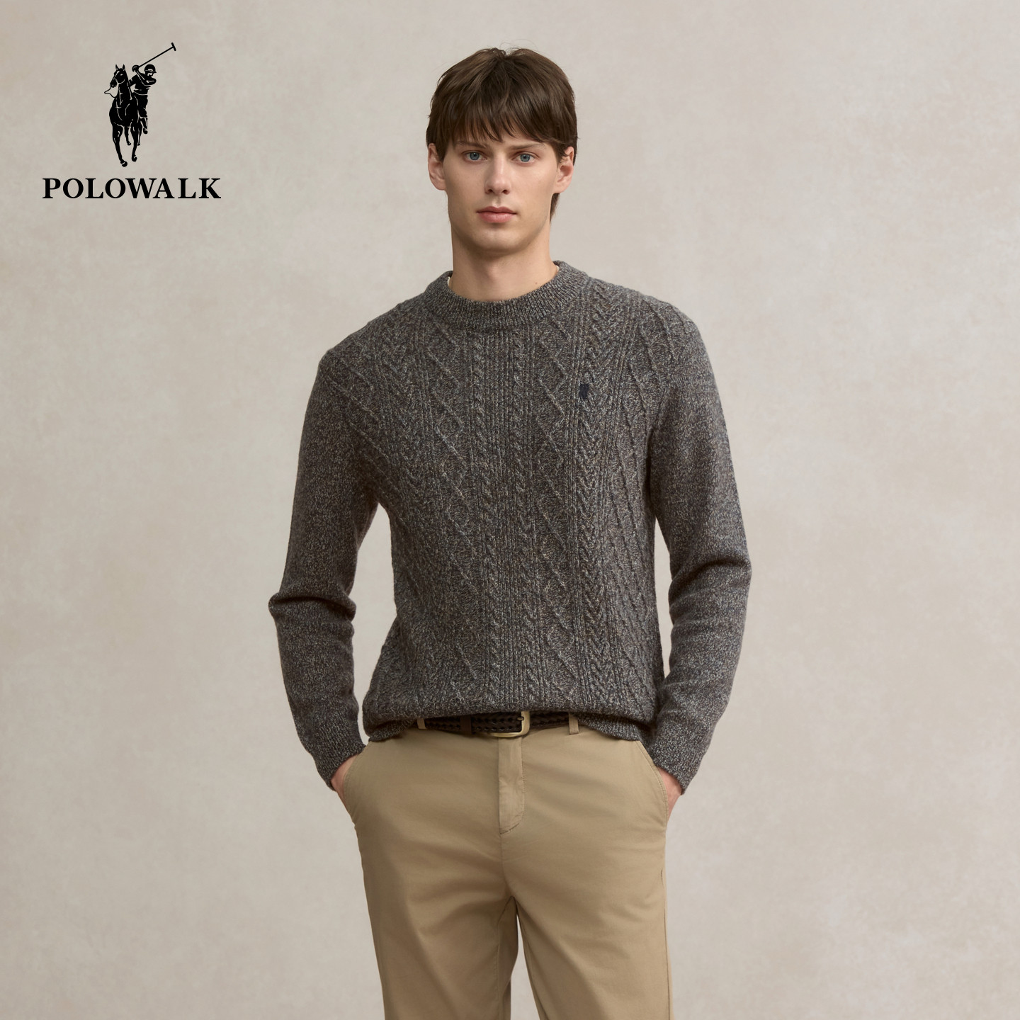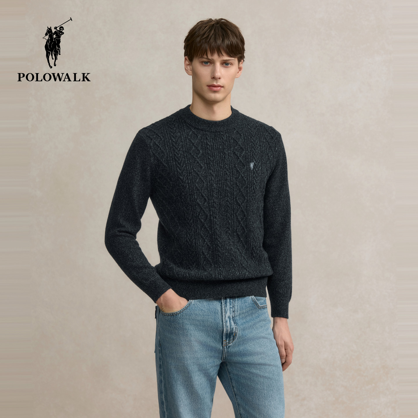 【100%绵羊毛】POLOWALK男式羊毛衫2025冬季新品绞花圆领套头上衣