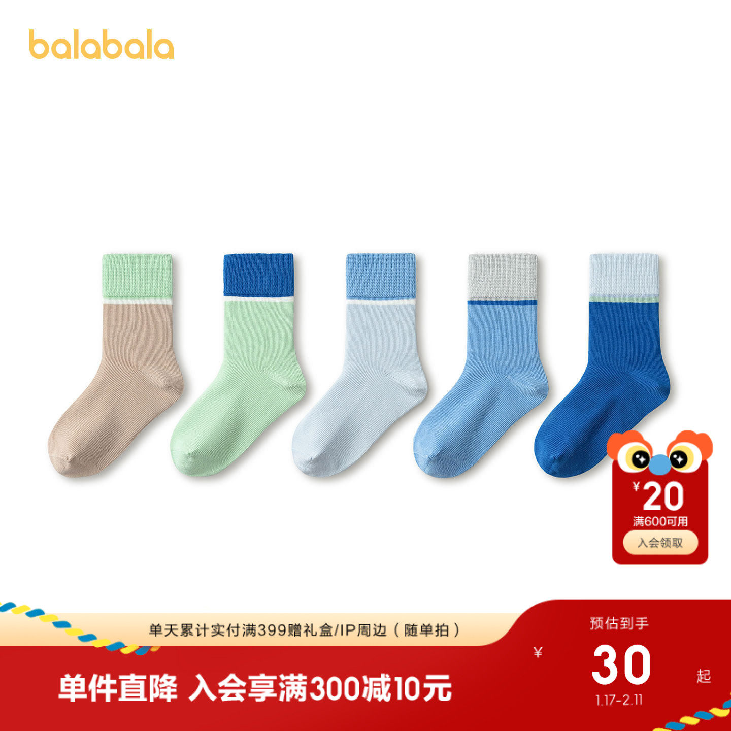 巴拉巴拉儿童袜子春秋男童女童棉袜儿童宝宝中大童学生打底五双装