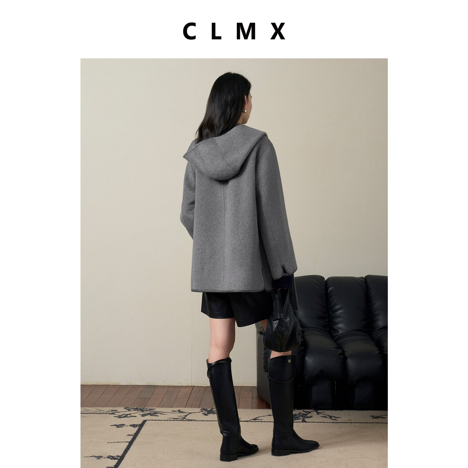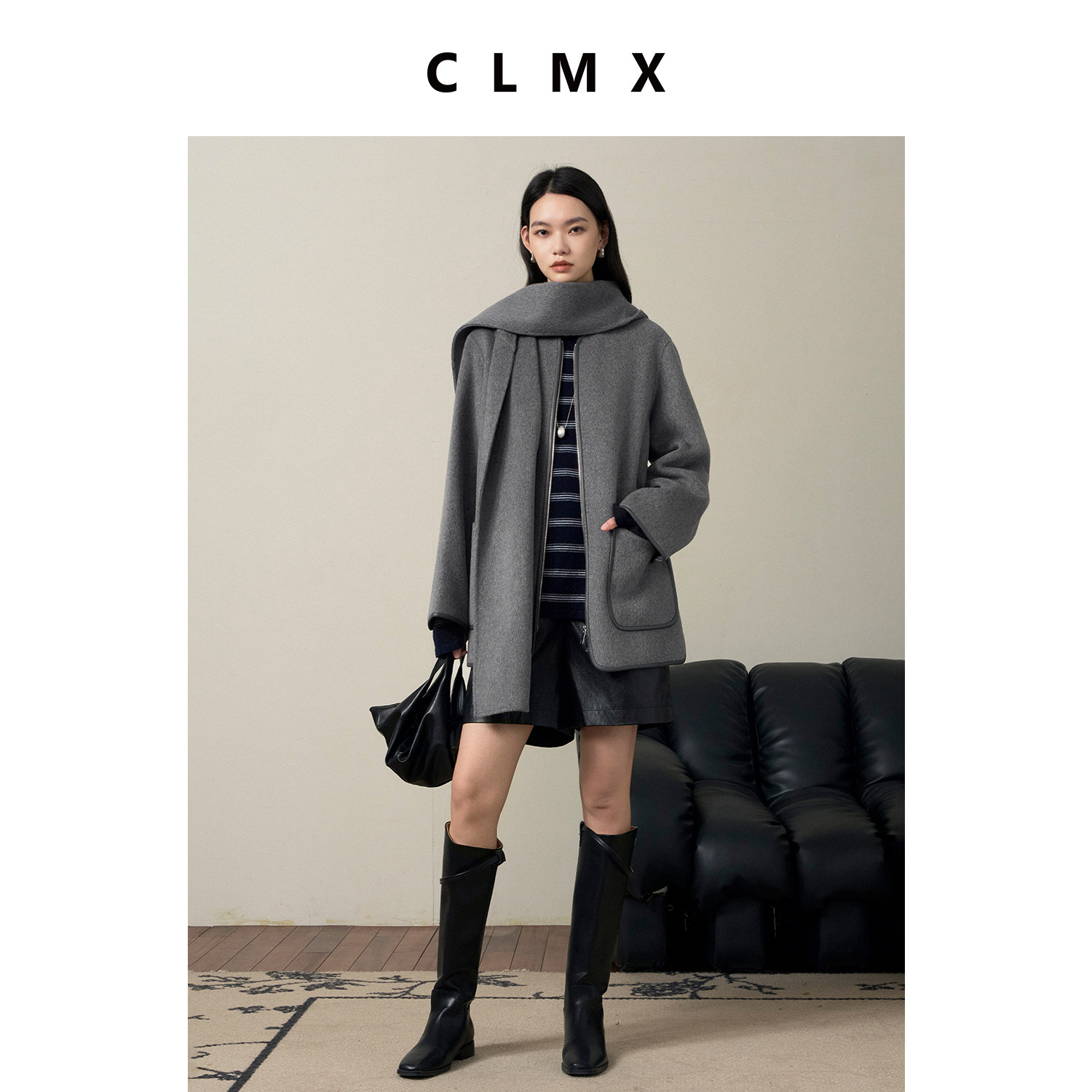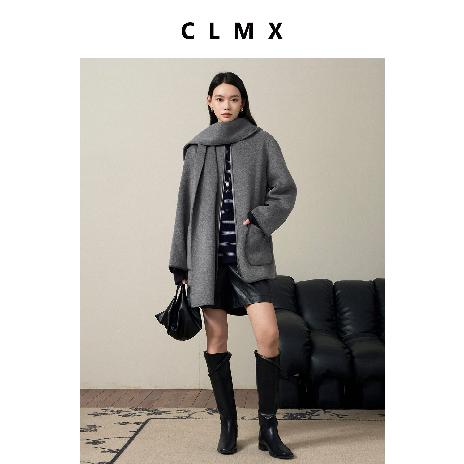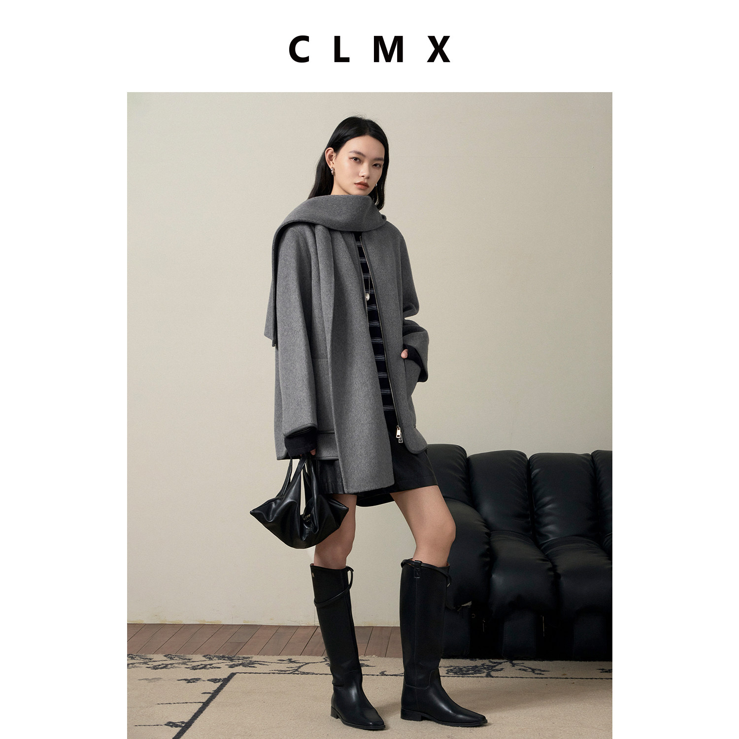 CLMX复古羊毛羊绒中长款围巾大衣女秋冬通勤高级保暖拉链毛呢外套