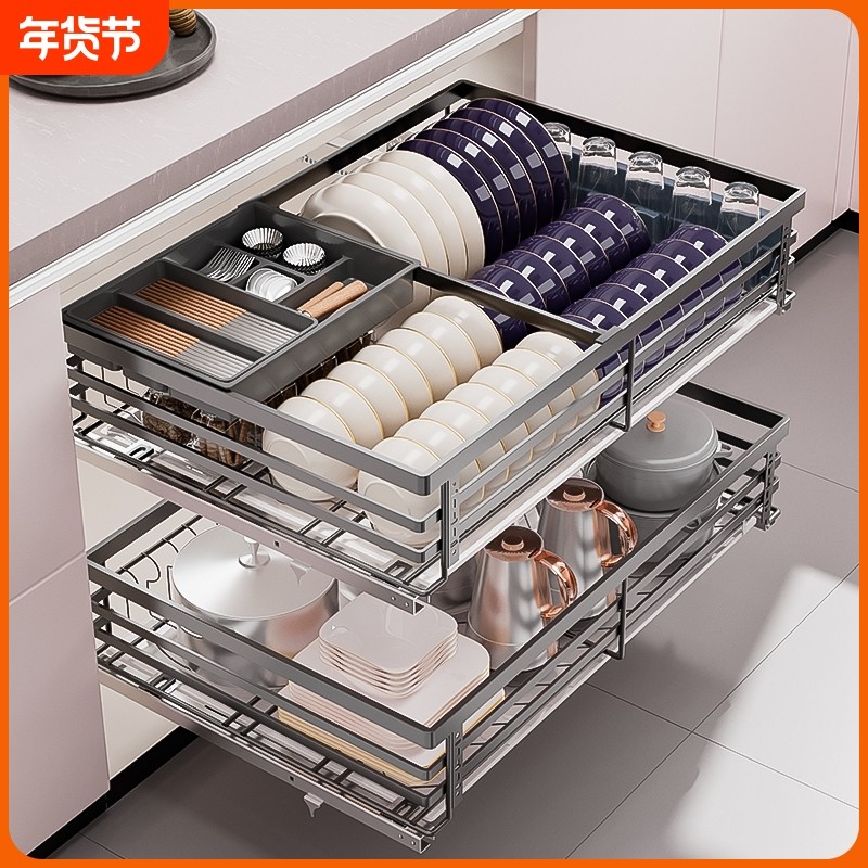 拉篮加深304不锈钢厨房抽屉双层阻尼调料橱柜内置物收纳碗碟架蓝