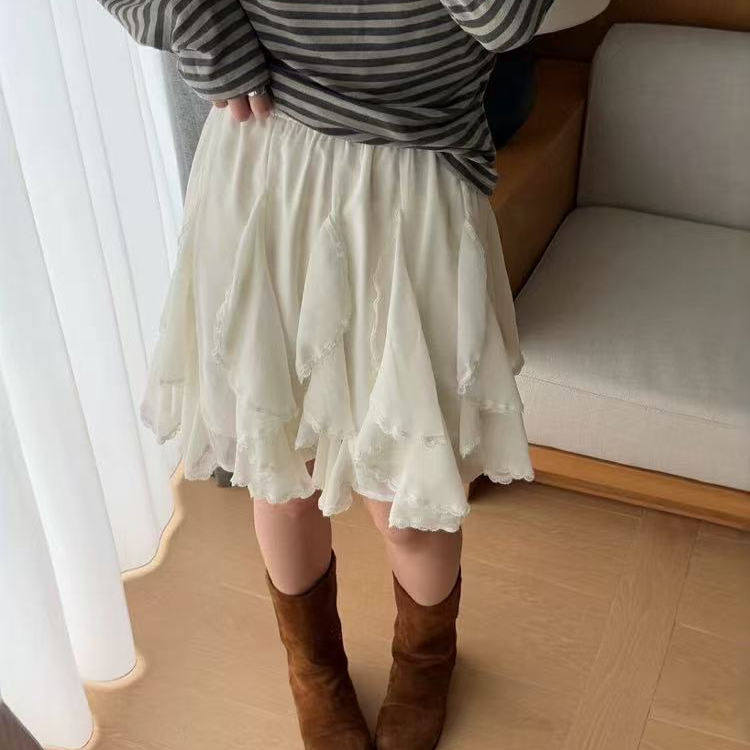 大码法式不规则蕾丝边半身裙女夏高腰显瘦蛋糕a字裙胖mm遮胯中裙