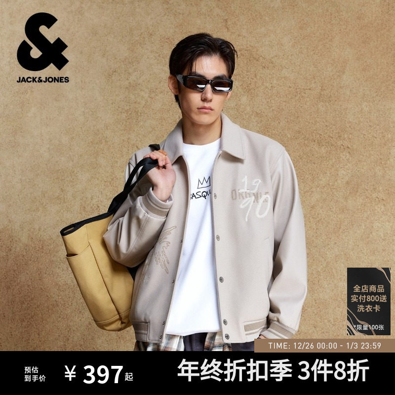 杰克琼斯25年秋季新款百搭夹克仿毛呢PU拼接外套宽松棒球服男装