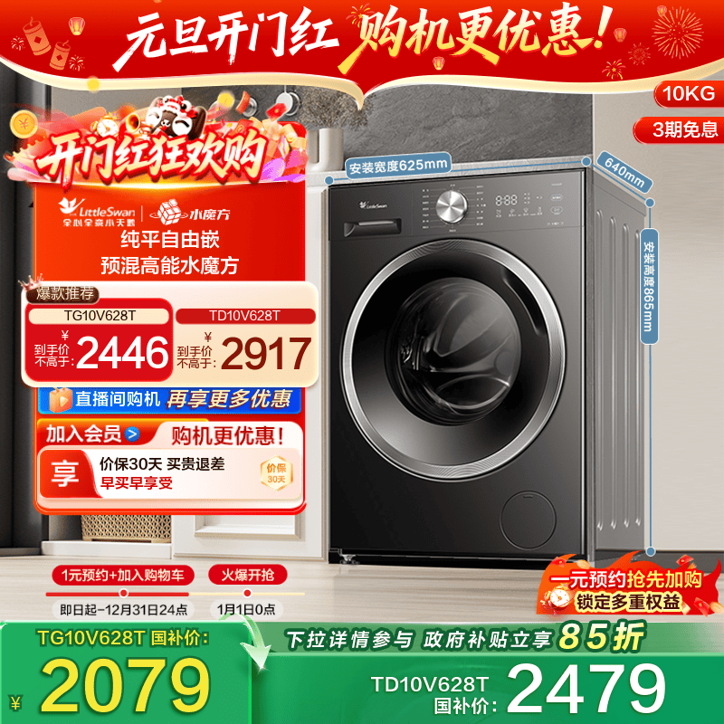 [纯平自由嵌]小天鹅水魔方洗衣机10KG全自动家用滚筒洗脱一体628T