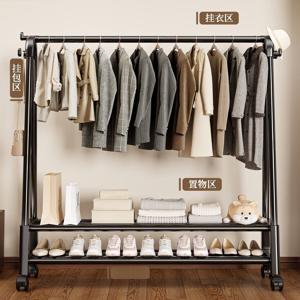 落地衣帽架家用置物加粗可移动收纳简易挂衣架卧室宿舍轻奢晾衣架
