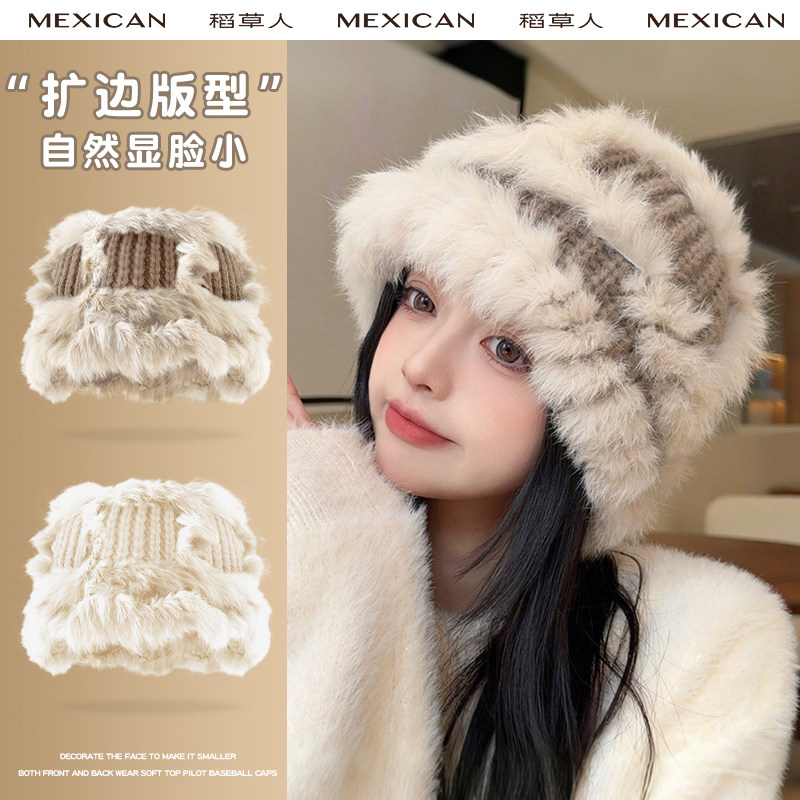 稻草人兔毛帽子女士冬季百搭时尚渔夫帽护耳防寒保暖针织毛绒盆帽